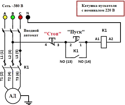 Рассмотрим 2 схемы подключения контактора к сети 380 В: для катушки с напряжением питания 380 В и 220 В.
