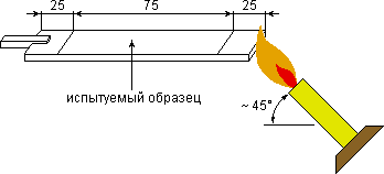 | UL 94 HB (horizontal burning test) | Образец держат горизонтально. Делают две отметки на расстоянии 25 и 100 мм и поджигают открытым пламенем пропан-бутановой горелки в течении 30 секунд (или до достижения фронта пламени на образце отметки 25 мм) (рис. 1). При толщине стенки до 3 мм скорость горения должна быть ниже 75 мм/мин, а при толщине стенки свыше 3 мм - ниже 40 мм/мин. | |