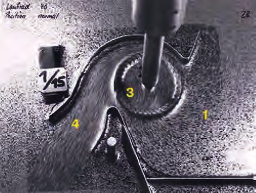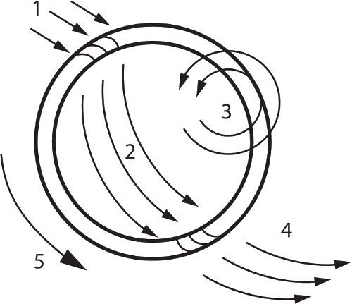 Такое перемещение воздуха обеспечивается центростремительной и центробежной силами. Это означает, что поток проходит через колесо двукратно, снаружи вовнутрь (1) и во второй ступени изнутри наружу (2- 4). Для того, чтобы при двукратном прохождении воздушного потока обеспечивалось вращение колеса без биений, необходим очень точный подбор геометрии лопаток. Основная задача, которую необходимо решить при проектировании геометрии лопаток, заключается в замедлении относительной скорости (1-2) и последующем ускорении потока при его повторном прохождении через лопаточную решетку (2-4). Геометрические параметры лопаток необходимо рассматривать во взаимосвязи с диаметром самого колеса, а также конструктивным исполнением корпуса вентилятора, что дополнительно затрудняет получение расчетных данных. Для точного определения геометрии лопаток требуется проведение испытаний и применение методов моделирования потока.