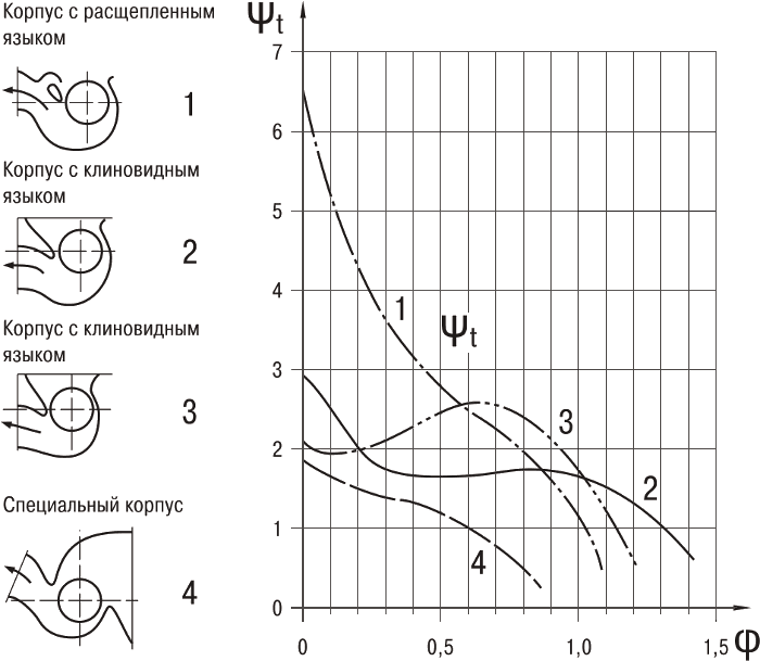 На графике (рисунок 3) представлены аэродинамические характеристики (безразмерные величины) в зависимости от исполнения корпуса. При изменении конструктивных особенностей корпуса и неизменном диаметре самого вентиляторного колеса изменяется широкая область характеристики. Такой диапазон изменения является существенным преимуществом, говорящим в пользу применения тангенциальных вентиляторов. Следует отметить, что крутые и стабильные аэродинамические характеристики можно получить с помощью относительно сложных конструктивных исполнений корпуса (например, корпус с расщепленным языком).