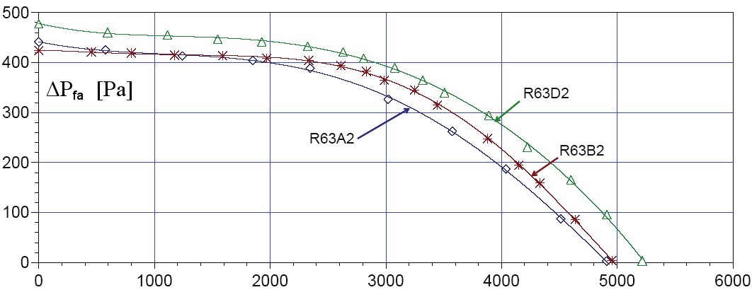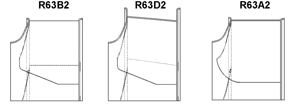 Эти предпосылки послужили известной германской фирме «ПУНКЕР» толчком к созданию высокоэффективных вентиляторных колес R63D2 и R63B2. Геометрия рабочих колёс обеих новых серий основывается на хорошо зарекомендовавшей себя серии R63А2. На рисунке 1 изображены осевые сечения колес всех трёх указанных серий.