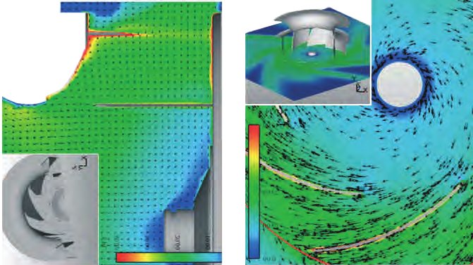 При конструировании новых вентиляторных колес специалистами фирмы «ПУНКЕР» использовались самые современные методы моделирования процессов. Так, например, программное обеспечение SFD (вычислительная гидроаэродинамика) позволяло наблюдать за картиной прохождения воздушных потоков (см. рисунок 2) с тем, чтобы на основе полученных данных аэродинамически оптимально спроектировать лопастной аппарат.