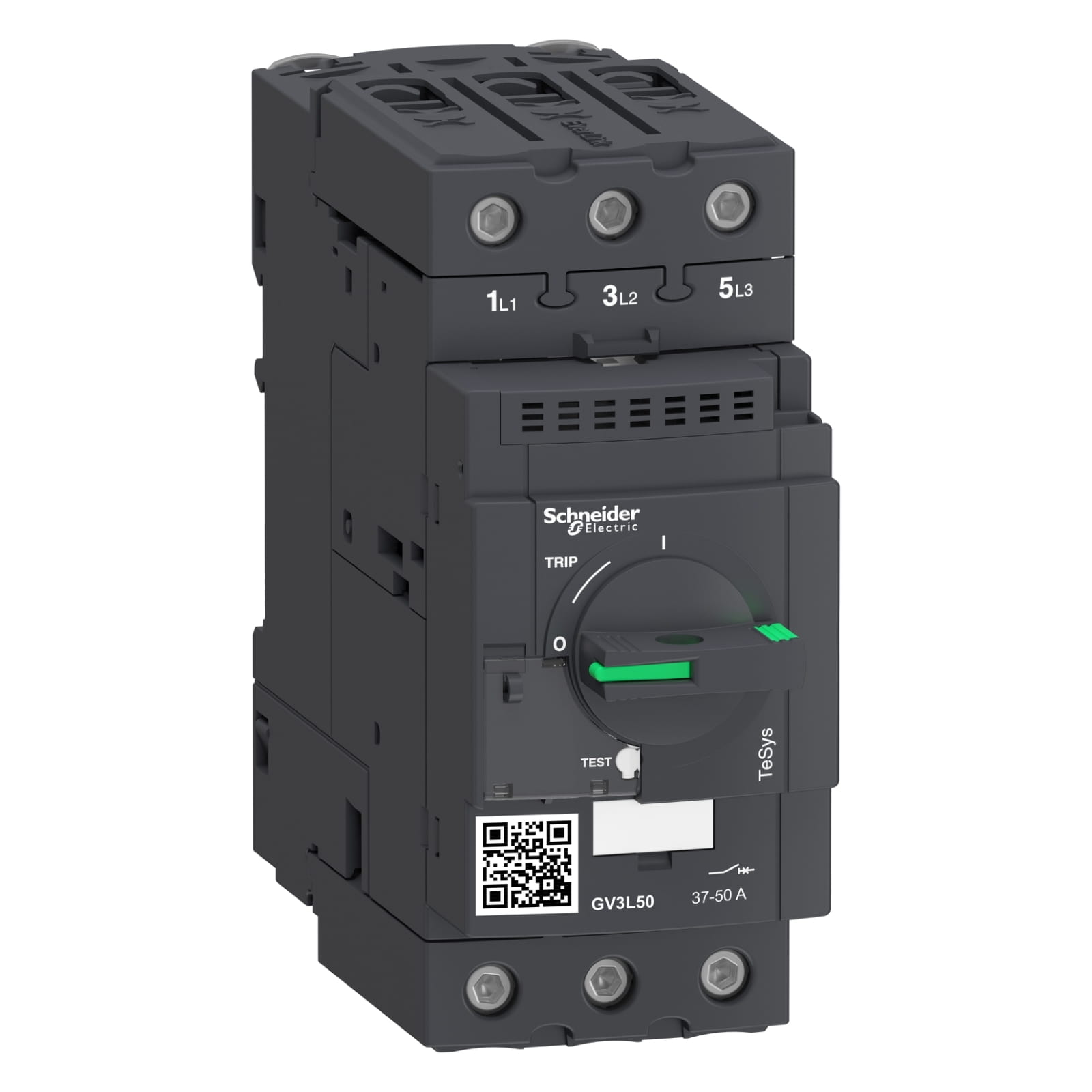 Трехполюсный автоматический выключатель с магнитным расцепителем GV3L50 специально предназначен для управления и защиты электродвигателей мощностью 22кВт (при 400…415V, переменный ток 50/60Гц) от перегрузки и короткого замыкания. Номинал электромагнитной защиты - 50А. Выключатель оборудован зажимами с винтами BTR (с внутренним шестигранником), которые затягиваются торцевым ключом No4. Новая запатентованная технология присоединения Everlink обеспечивает постоянное качество зажима кабелей. Даже в случае текучести проводников сила сжатия кабелей остается неизменной благодаря действию пружины силового соединителя.
