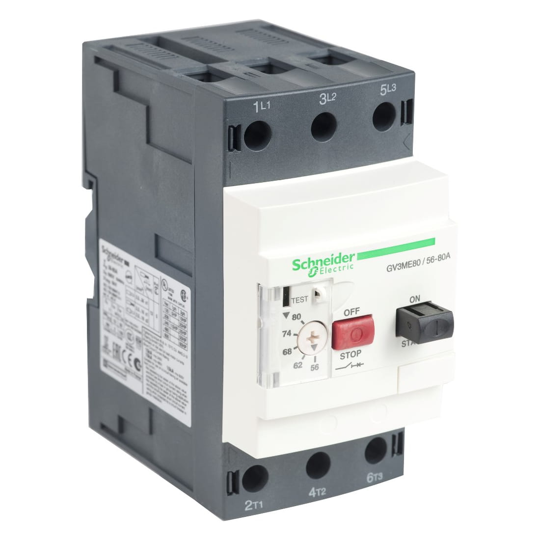 Трехполюсный автоматический выключатель GV3ME80 с теплоэлектромагнитным расцепителем специально предназначен для управления и защиты электродвигателей в соответствие со стандартами МЭК 60947-2 и 60947-4-1.