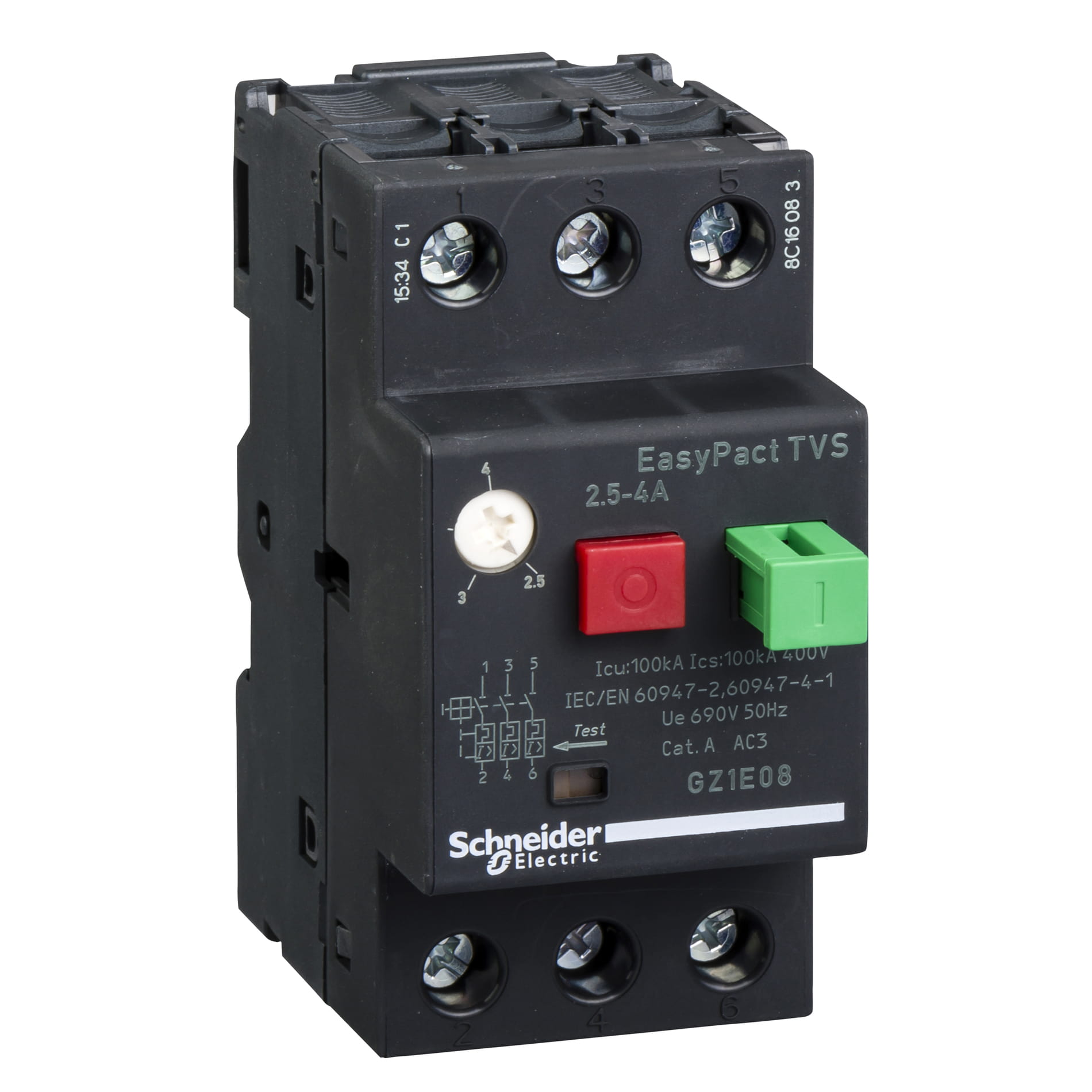 Трехполюсный автоматический выключатель GZ1E08 предназначен для управления и защиты электродвигателей мощностью 1.5кВт (при 400V AC-3) от перегрузки и короткого замыкания.