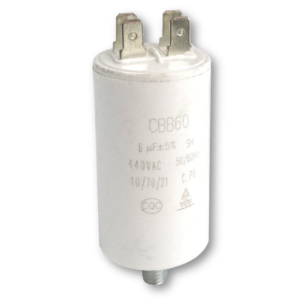 Конденсатор CBB60 емкостью 6мкФ и рабочим напряжением 440В АС предназначен для запуска и работы однофазных электродвигателей в цепях переменного тока. Подходит для внешнероторных моторов с толщиной статора 47мм и диаметром 102мм.
