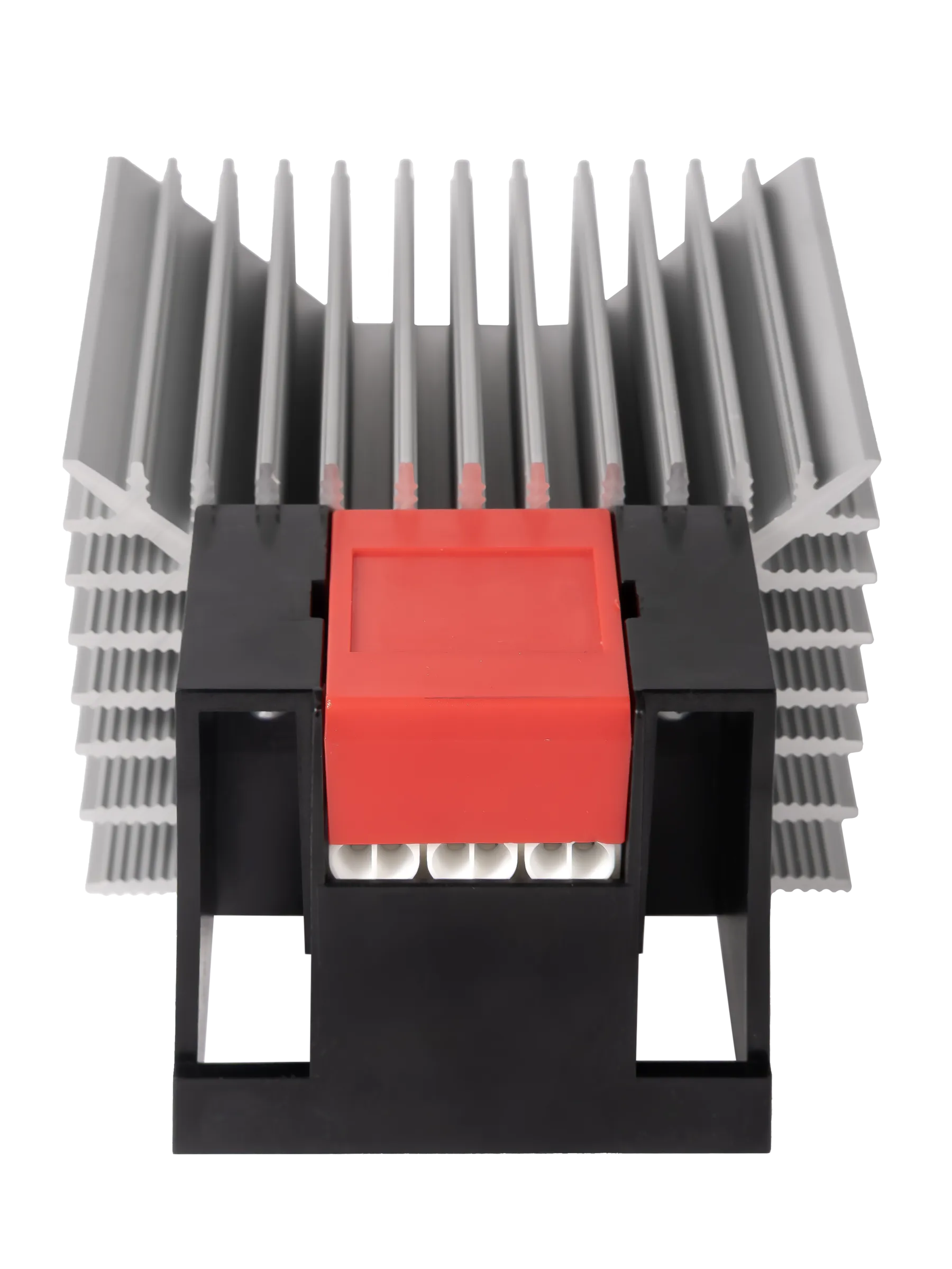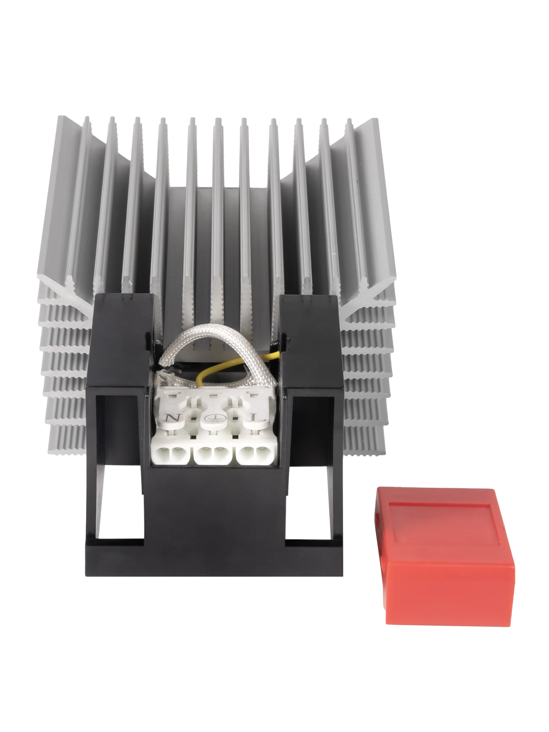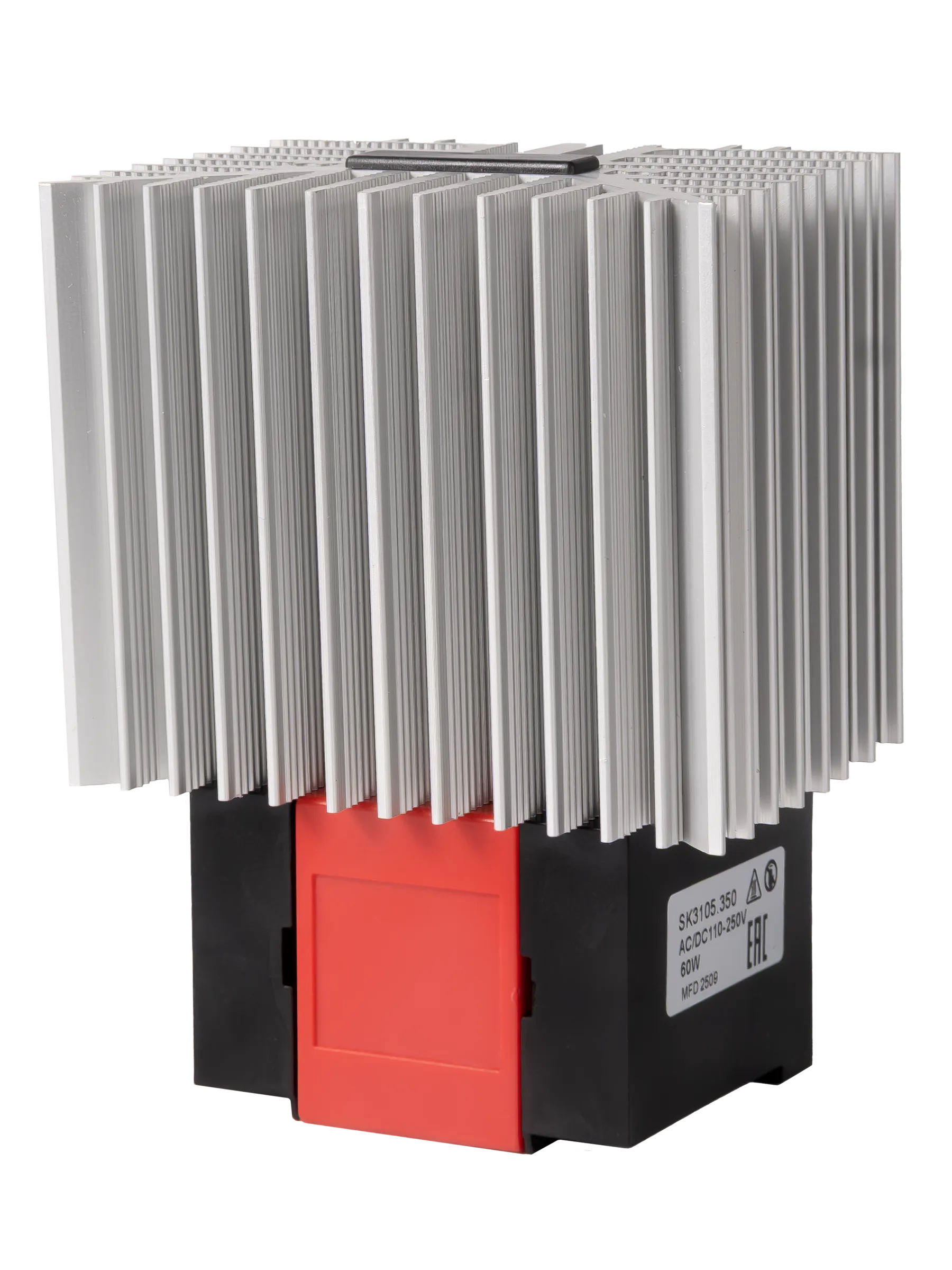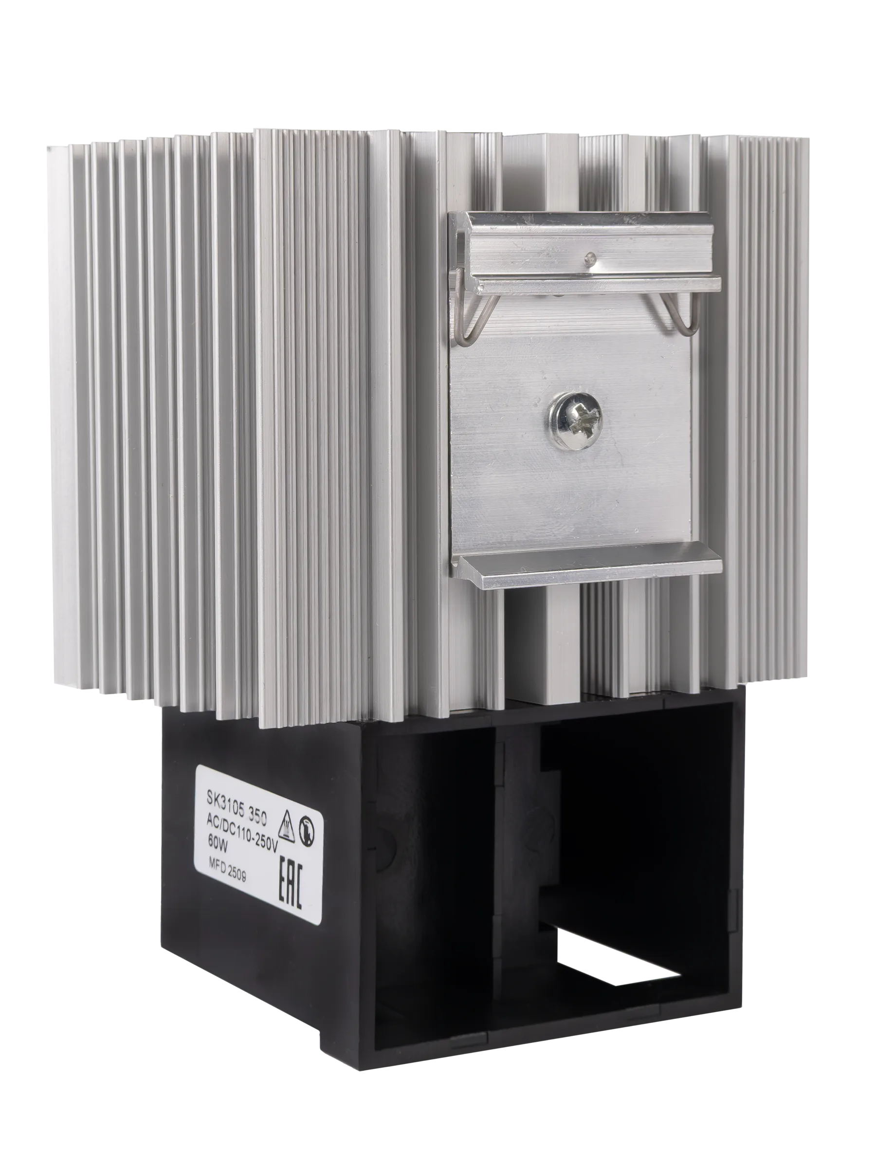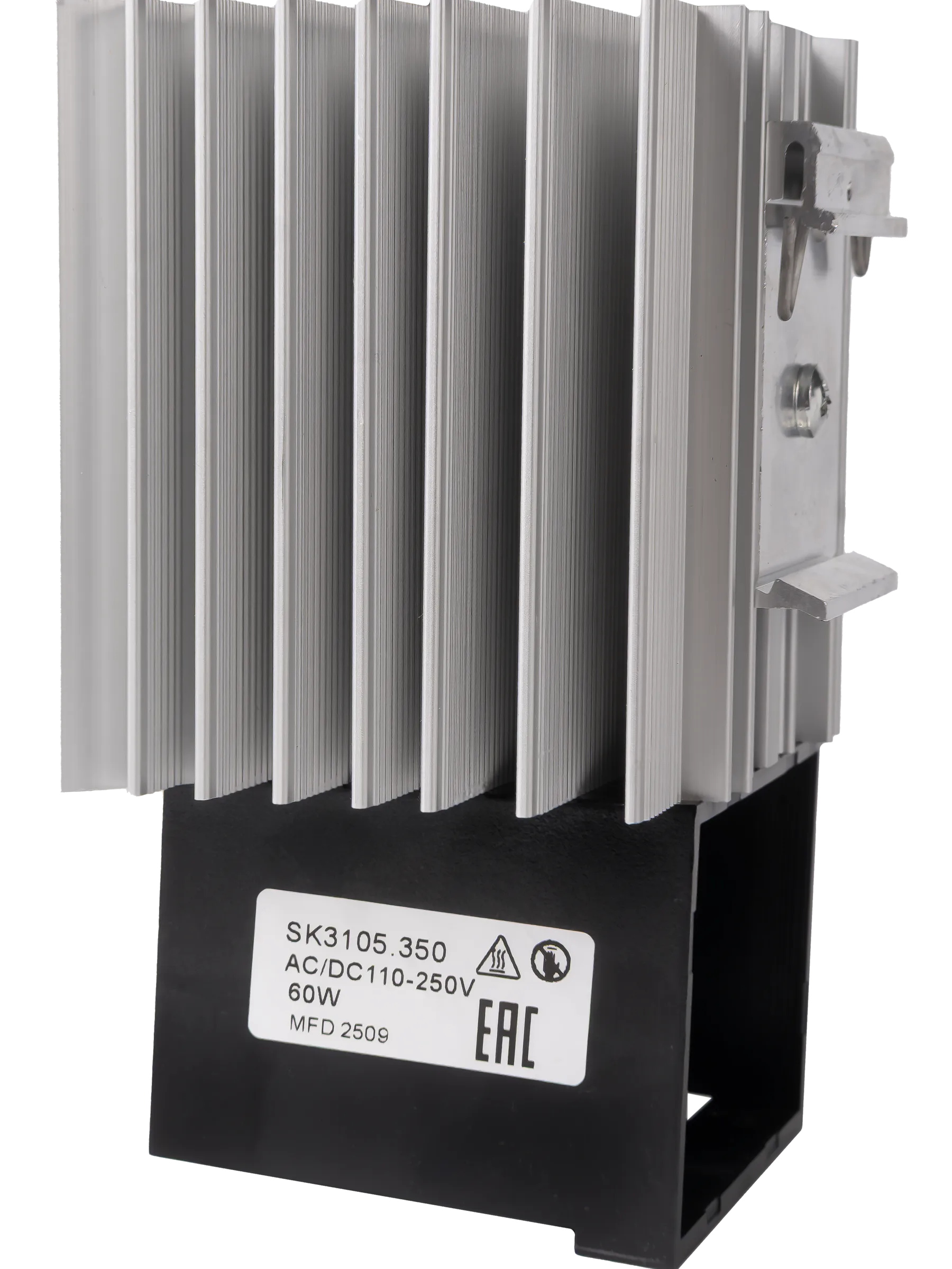 The heater SK3105.350 is used in enclosures where damage from condensation must be prevented, or where the temperature may not fall below a minimum value. The aluminium profile heater body design has a chimney effect and distributes the heat evenly. The pressure clamp connectors save time and simplify installation.