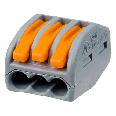 3-conductor terminal block with operating levers 222-413 is designed to connect solid and stranded wires with max cross section up to 2.5mm2, fine-stranded wires with max cross-section 4mm2.