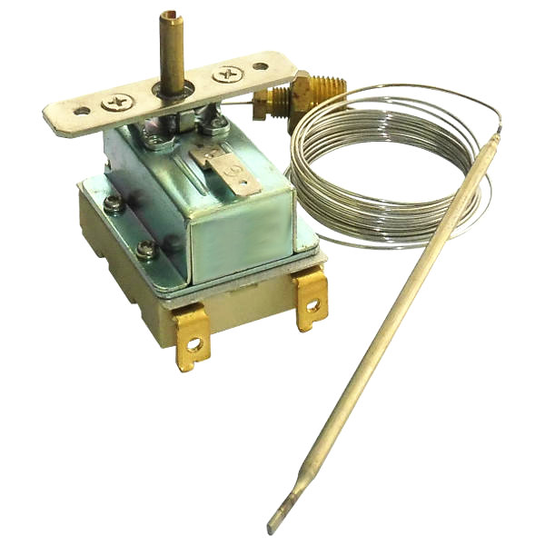 Adjustable double-pole capillary thermostat WKG-320S4 is designed to maintain the required temperature in the controllable device or its parts. A rise in temperature causes the expansion of liquid within the bulb and capillary. The liguid acts on a bellows assembly within the plastic housing to open electrical contacts. Area of application - gas ovens and other heating devices.