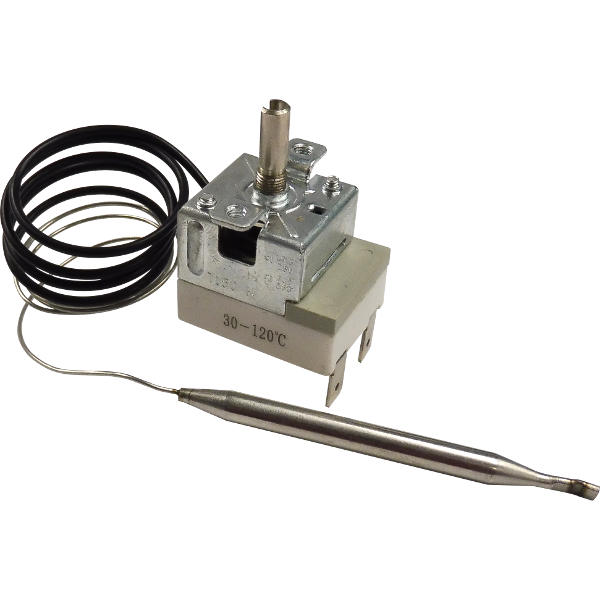Adjustable single-pole capillary thermostat WZA-120E is intended for support of given temperature in the controllable device or its parts. A rise in temperature causes the expansion of liquid within the bulb and capillary. The liquid acts on a bellows assembly within the plastic housing to open electrical contacts.