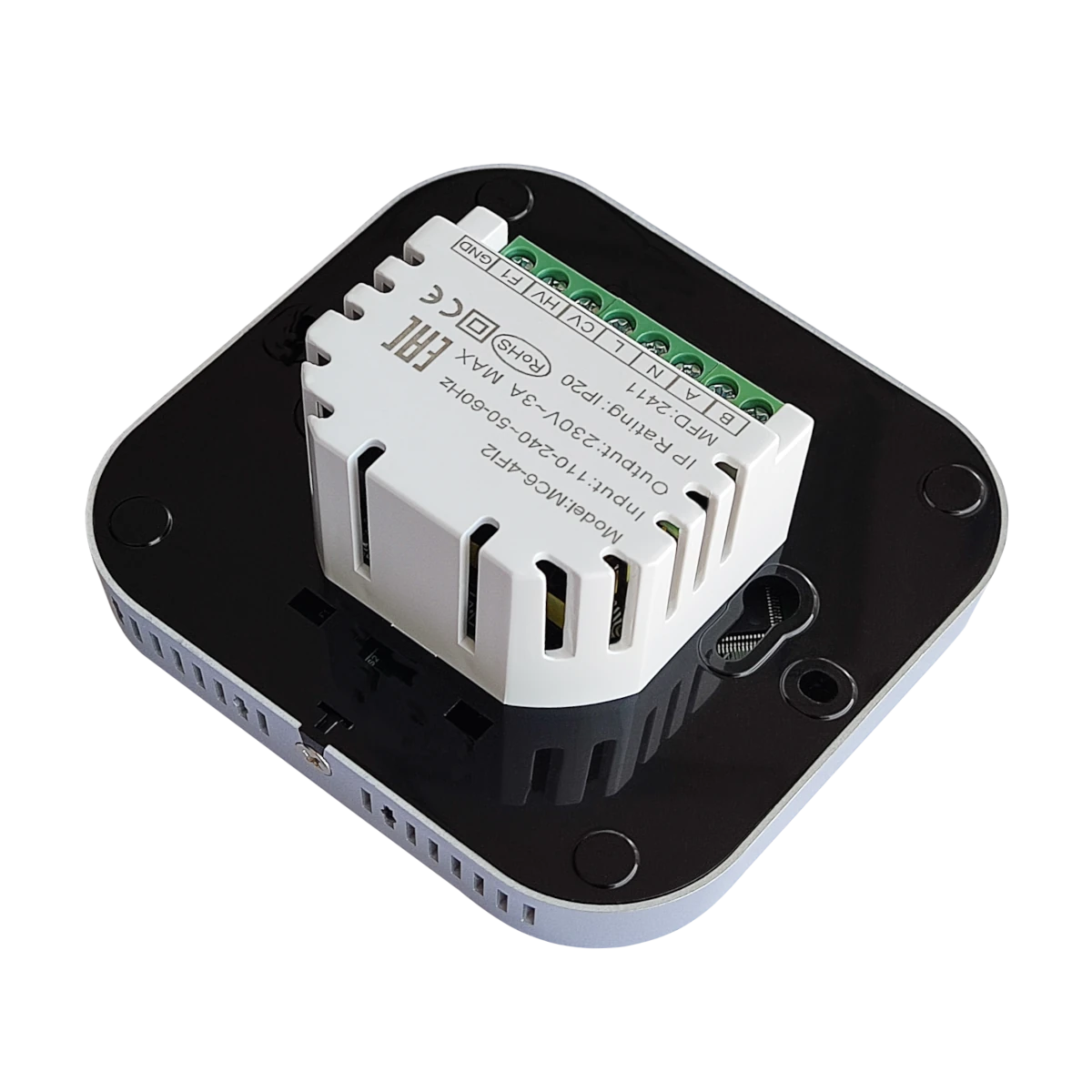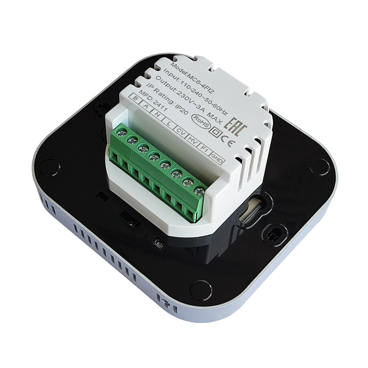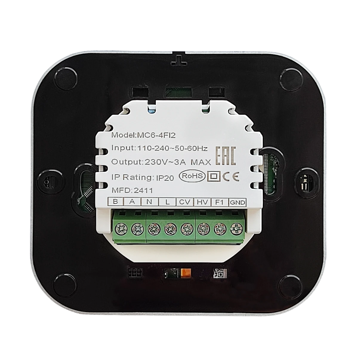 MC6-4FI2 BLACK touchscreen programmable room thermostat with WiFi is designed to on/off control the fans and valves in air conditioners, to achieve the purpose of comfort and energy saving.