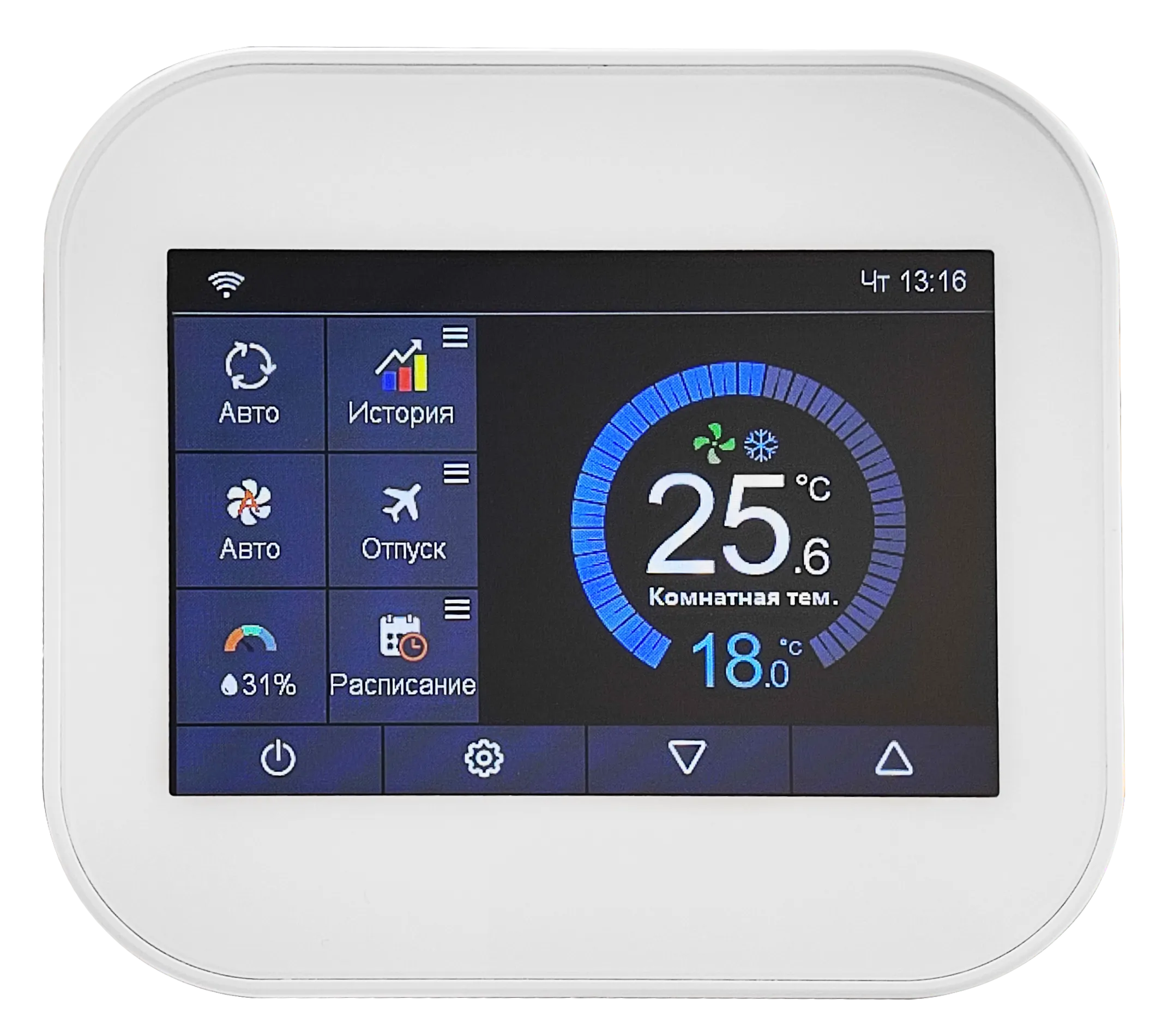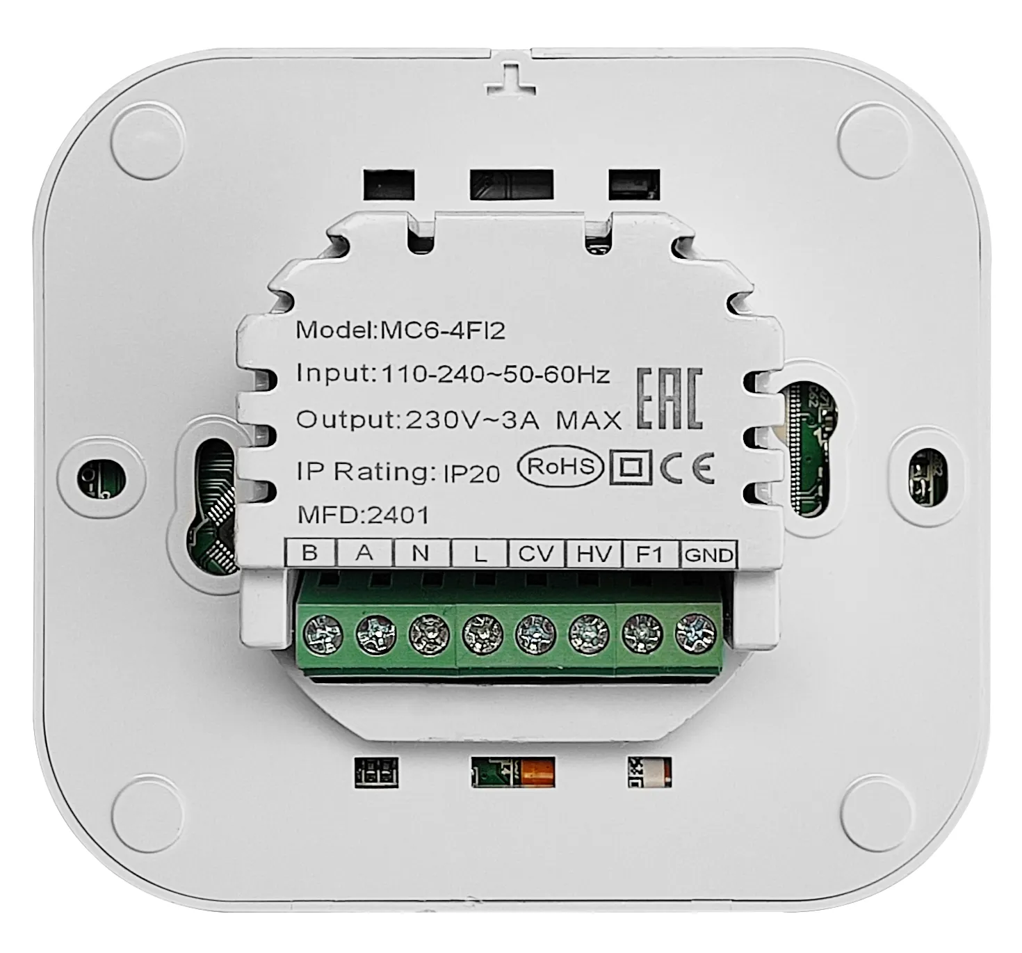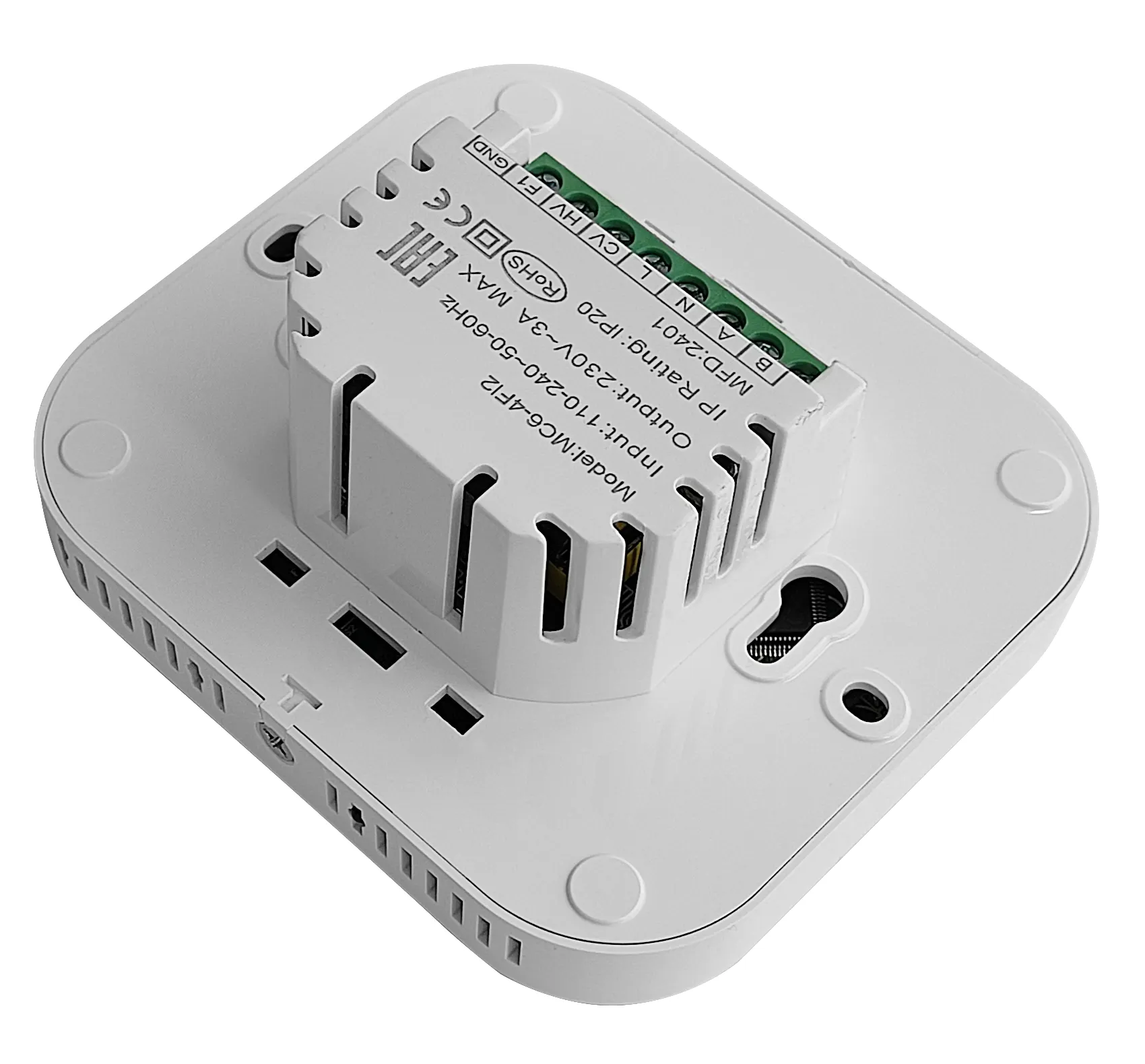 MC6-4FI2 WHITE touchscreen programmable room thermostat with WiFi is designed to on/off control the fans and valves in air conditioners, to achieve the purpose of comfort and energy saving.