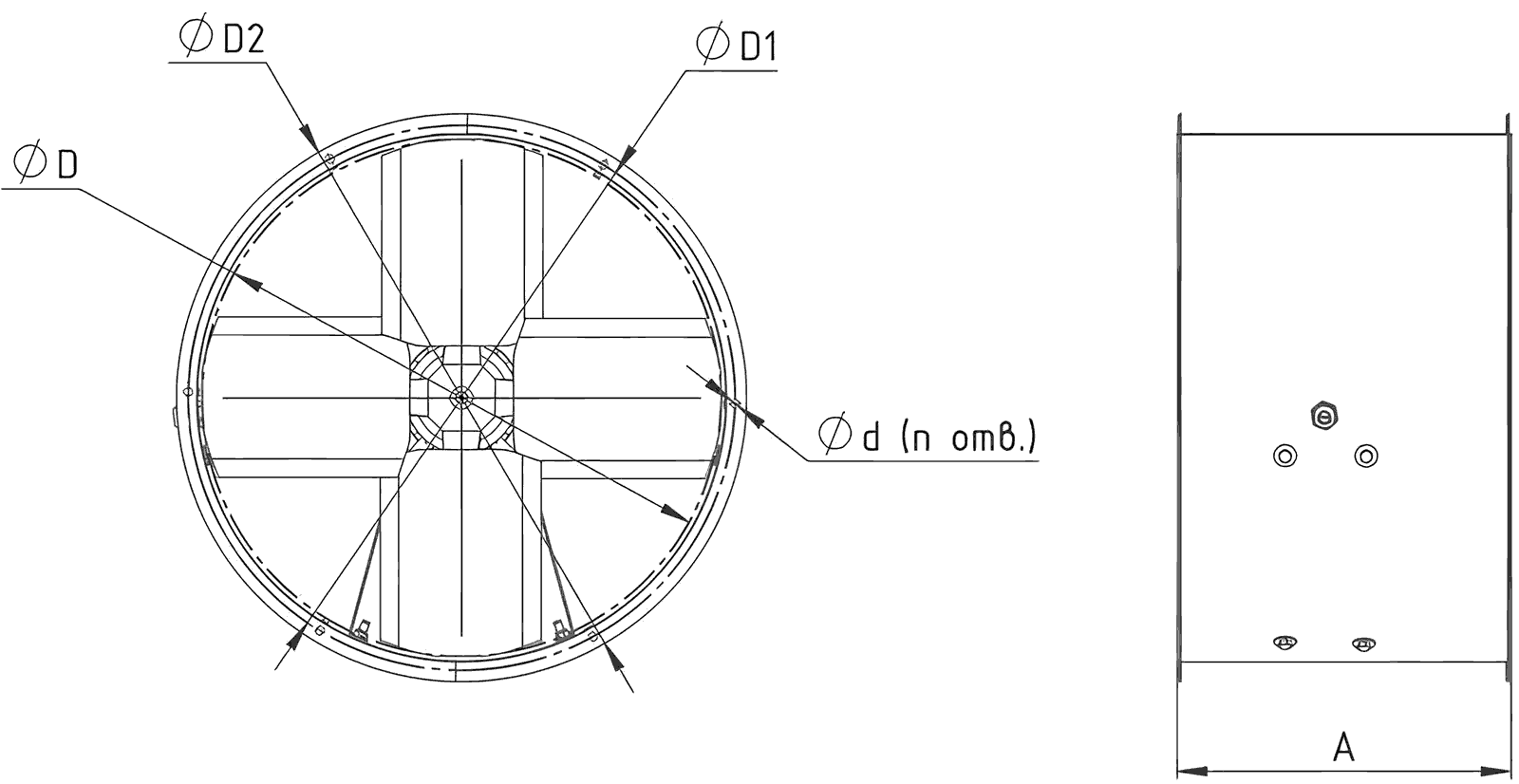 | Модель вентилятора | Мощность/частота вращения | А | D | D1 | D2 | d | n |