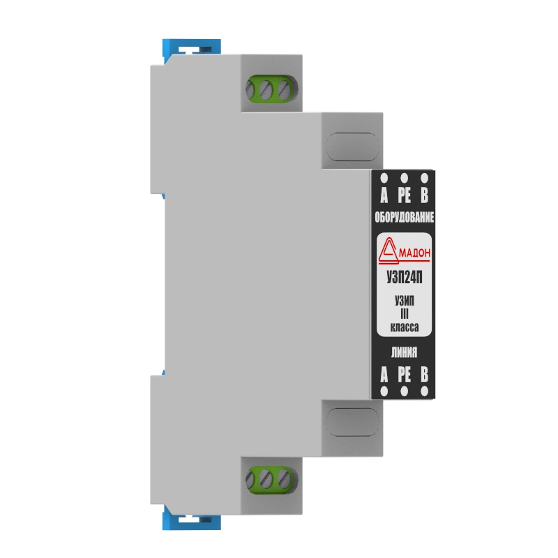 УЗП24П - устройство защиты линий вторичного питания распределительных сетей аппаратуры промышленной автоматизации, систем сигнализации и подобных устройств от импульсных перенапряжений (грозовых, электростатических разрядов и т.п.). Устройство имеет напряжение 24В постоянного тока.
