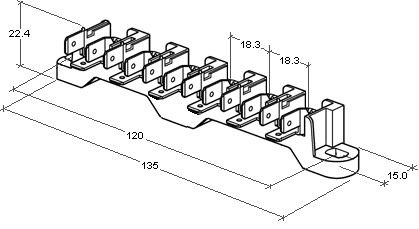 Шестиполюсная клеммная колодка для подключения наконечников типа "фастон" 6.3x0.8. Каждый "полюс" имеет возможность подключения трех фастонов. Для увеличения количества подключений между соседними полюсами может устанавливаться медная перемычка.