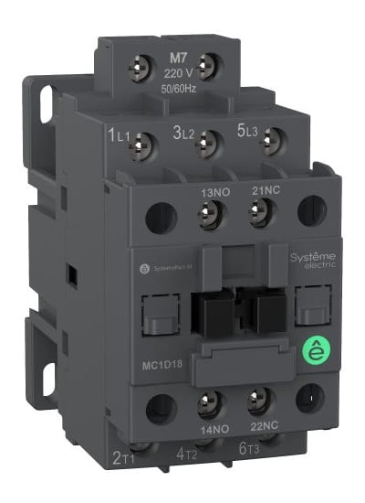 Контакторы переменного тока общепромышленного применения MC1D18M7 на ток нагрузки 18А предназначены для пуска, остановки и реверсирования асинхронных электродвигателей с короткозамкнутым ротором на напряжение до 660 В (категория применения АС-3), а также для дистанционного управления цепями освещения, нагревательными цепями и различными малоиндуктивными нагрузками (категория применения АС-1).
