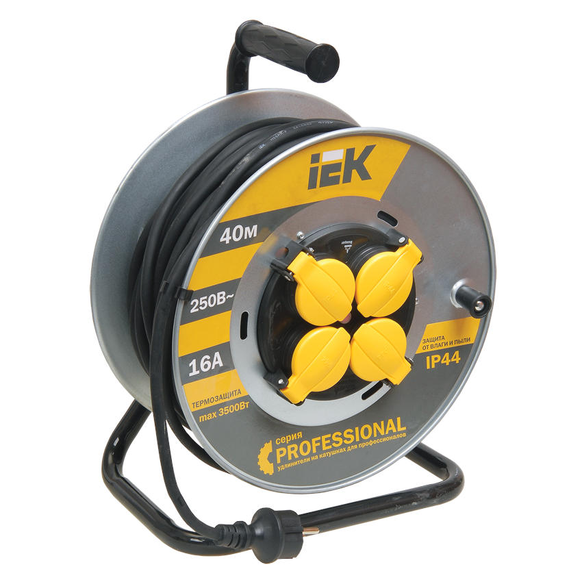 Удлинитель УК40 катушечный на металлическом корпусе серии Professional. 4 розетки с заземлением, длина кабеля 40 метров. Степень защиты IP44. Незаменим на строительной площадке, на садовом участке, в малом бизнесе, в парках с аттракционами, в промышленности и в быту. Тепловое реле защищает от превышения максимально допустимой подключаемой нагрузки. Изолирующая прорезиненная ручка обеспечивает безопасную и комфортную эксплуатацию.