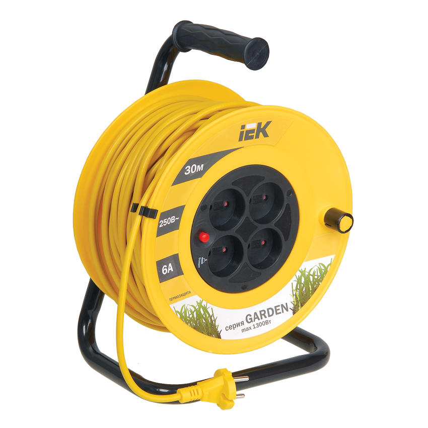 Удлинитель УК30 катушечный серии Garden на 4 розетки, длина кабеля 30 метров. Незаменим на строительной площадке, на садовом участке, в малом бизнесе, в парках с аттракционами, в промышленности и в быту. Тепловое реле защищает от превышения максимально допустимой подключаемой нагрузки. Изолирующая прорезиненная ручка обеспечивает безопасную и комфортную эксплуатацию.