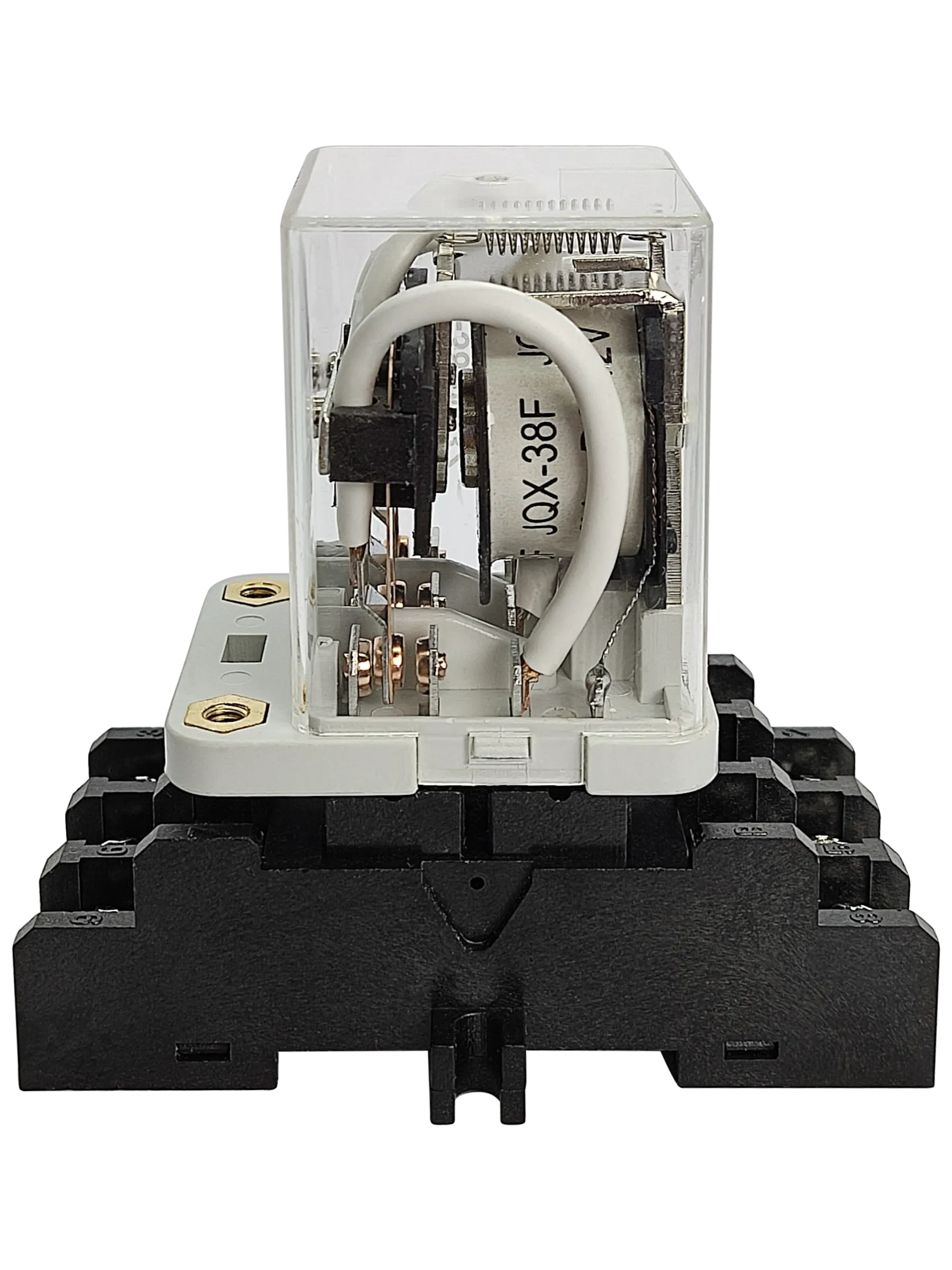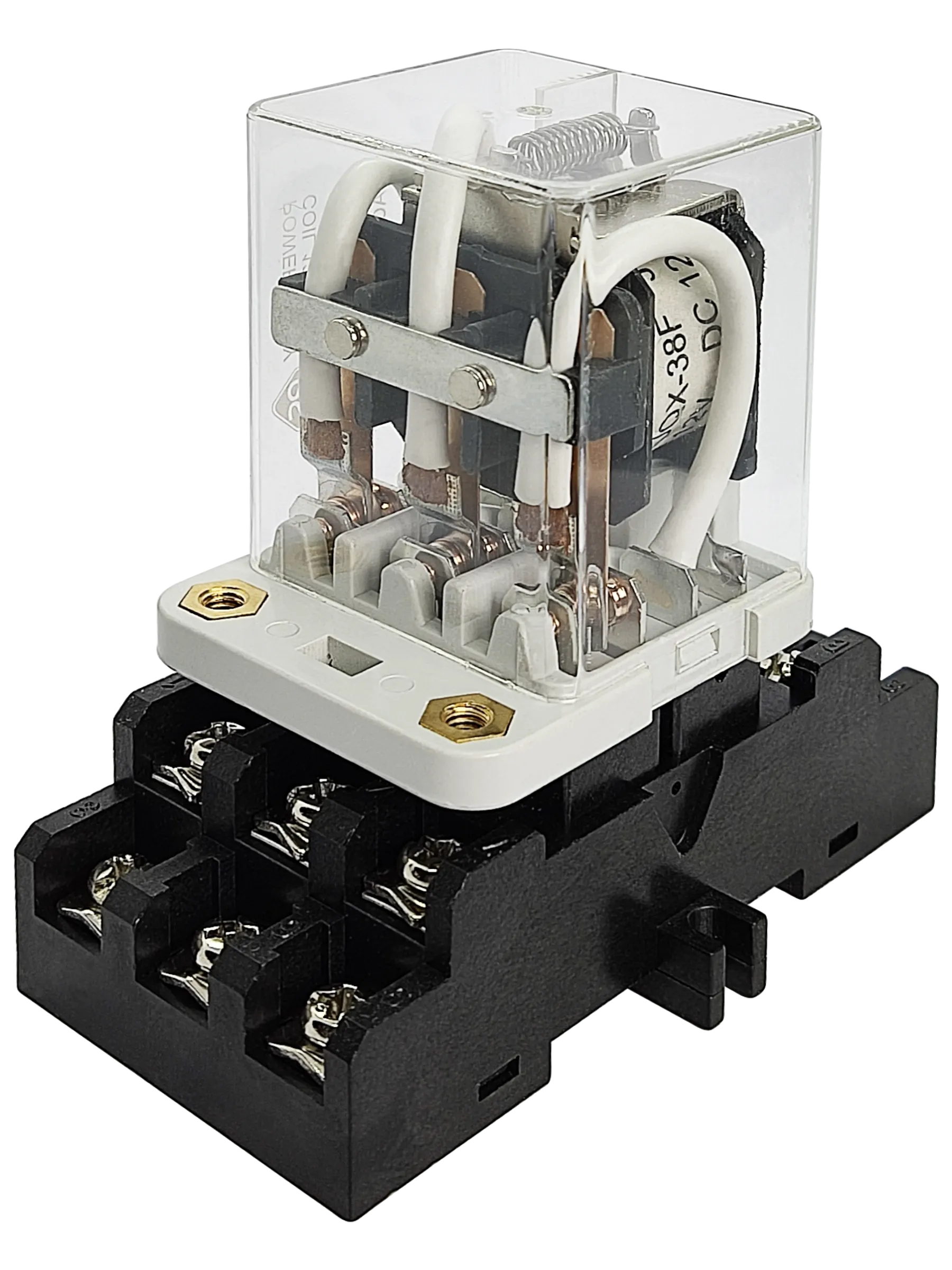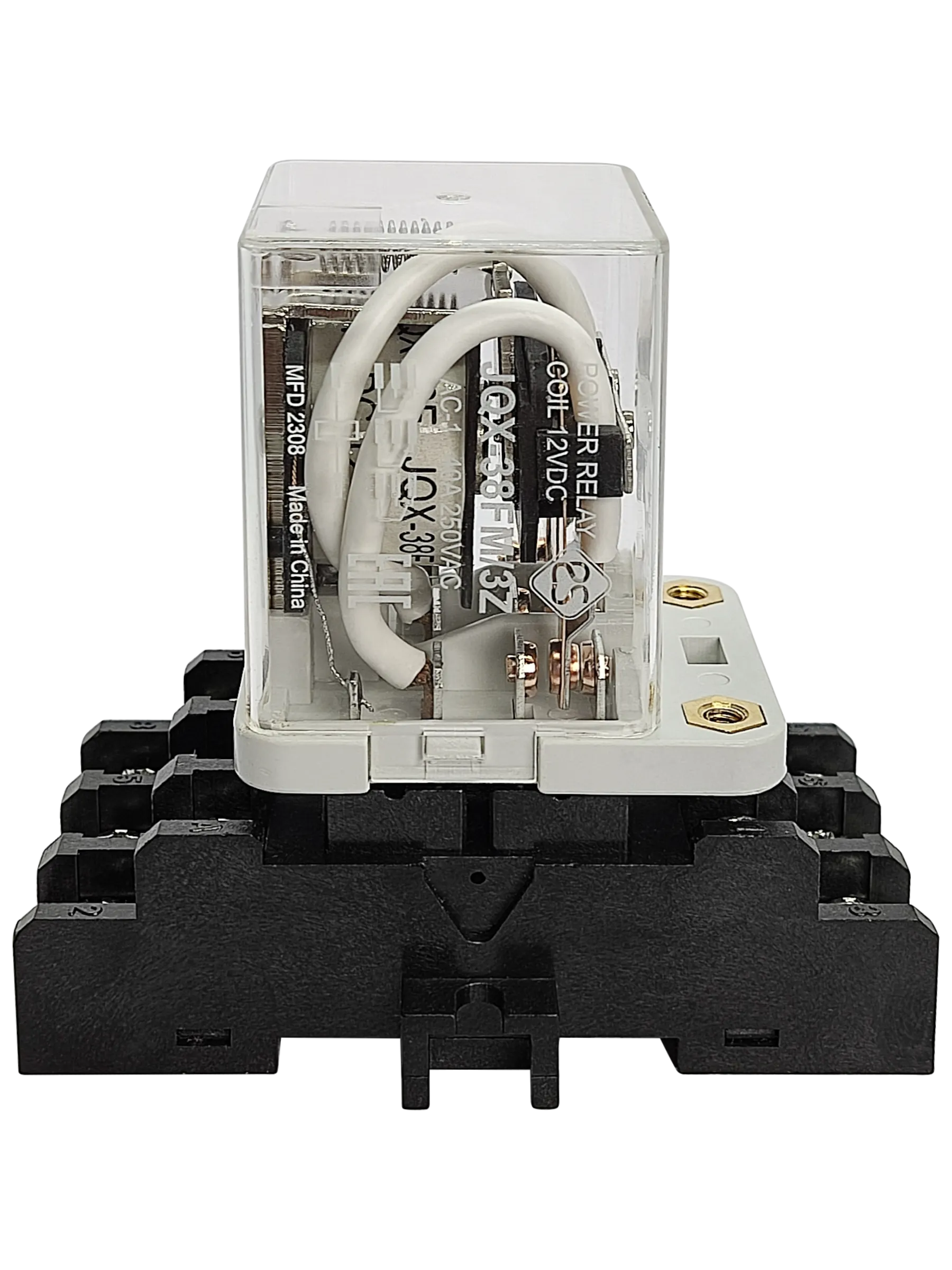 Силовое промежуточное реле JQX-38FM/3Z с тремя перекидными контактами (3PDT) в сборе, состоит из реле JQX-38F/3Z-12Vdc и колодки 3F.
