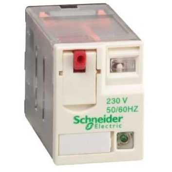 Миниатюрное электромагнитное реле Zelio Relay RXM2AB2P7 с номинальным током 12А и напряжением управляющей катушки 230В АС. На лицевой панели реле расположены: