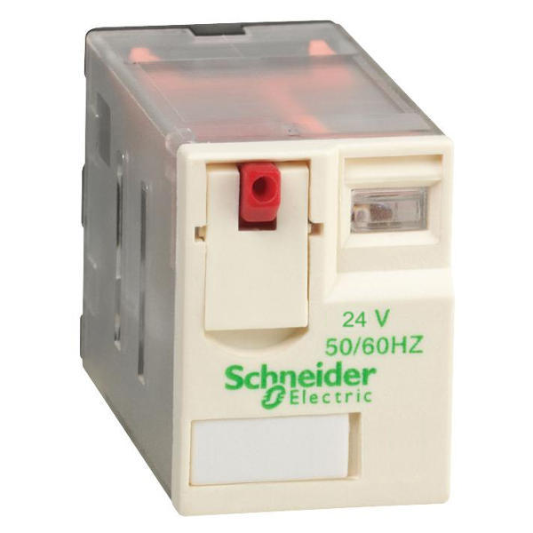 Миниатюрное электромагнитное реле Zelio Relay RXM4AB1B7TQ с номинальным током 6А и напряжением управляющей катушки 24В AС. На лицевой панели реле расположены: