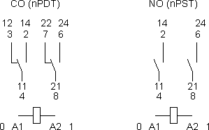 2 перекидных контакта (DPDT) или 2 контакта NO (DPST-NO)