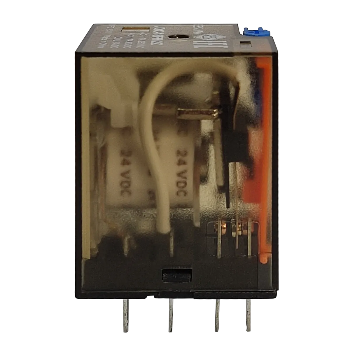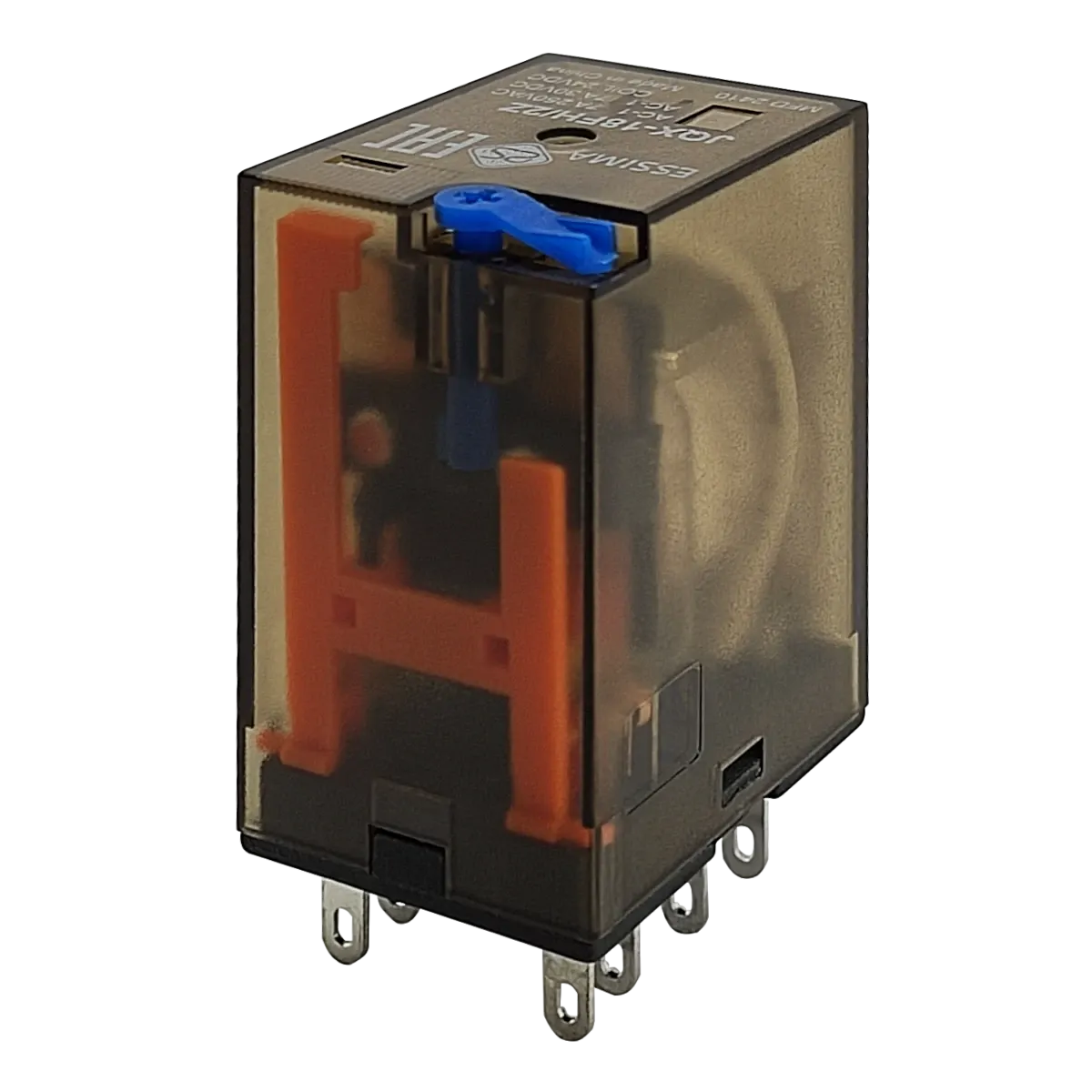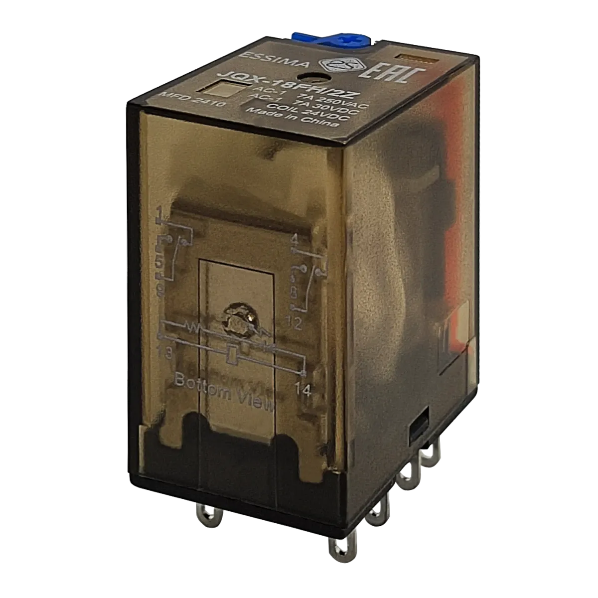 Универсальное реле JQX-18FH с двумя перекидными контактами. Допустимый ток через контакты до 7 ампер по категории применения AC-1. Напряжение питания управляющей катушки - 24В постоянного тока.