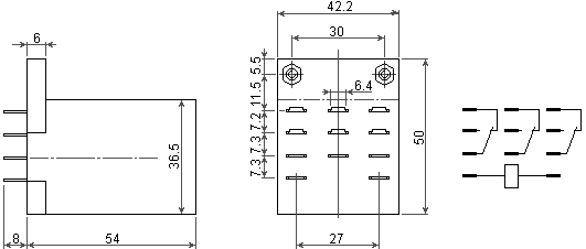 Электромагнитное промежуточное реле JQX-38F с тремя перекидными контактами (3PDT). Допустимый ток через контакты до 40 ампер. Управляющая катушка 48В постоянного тока.