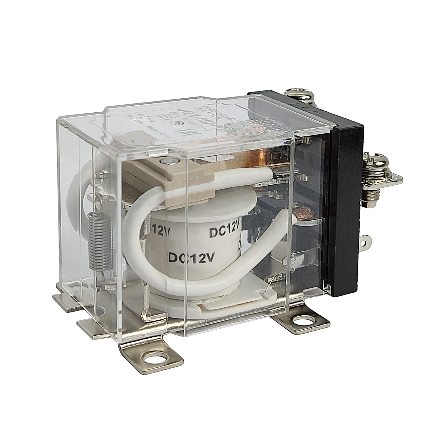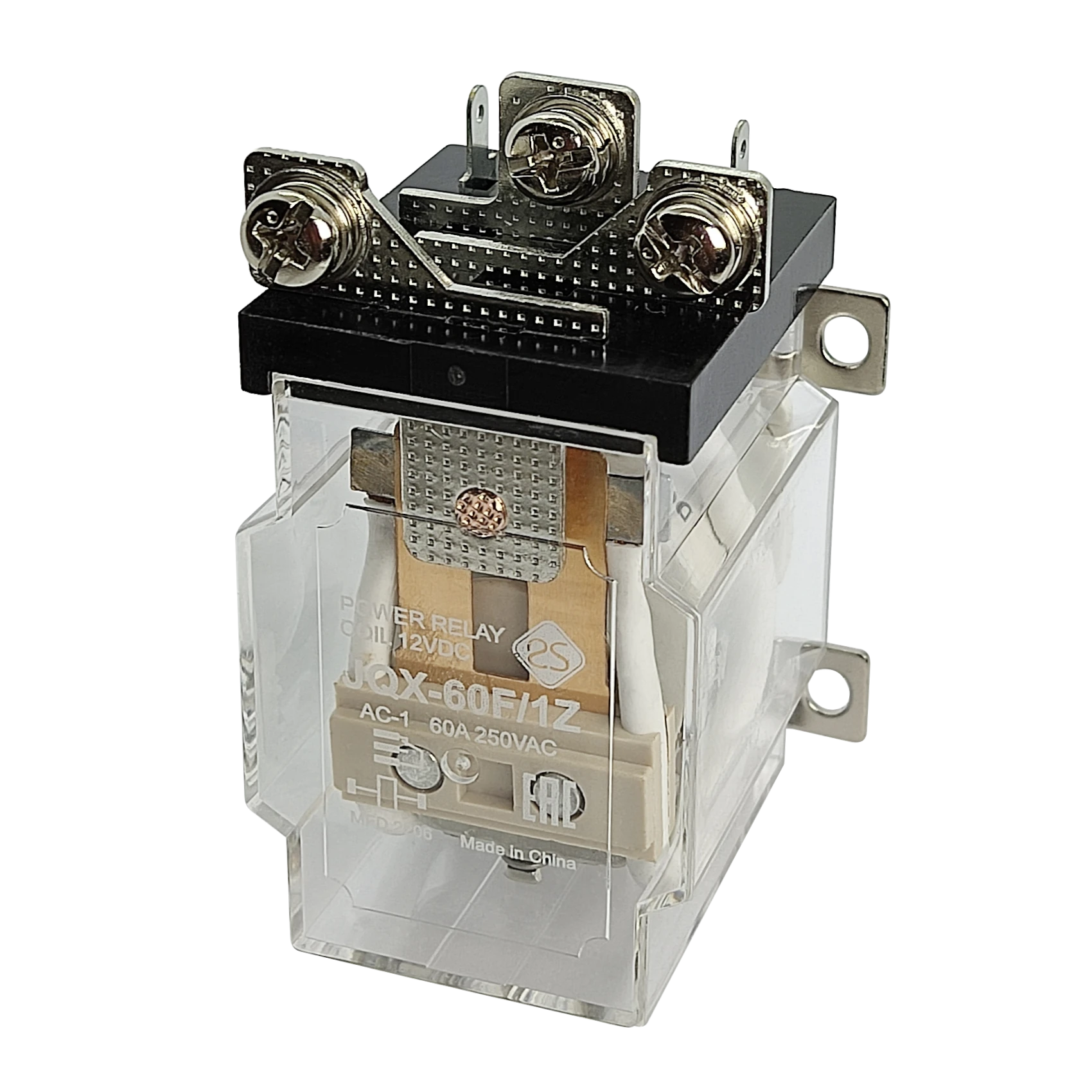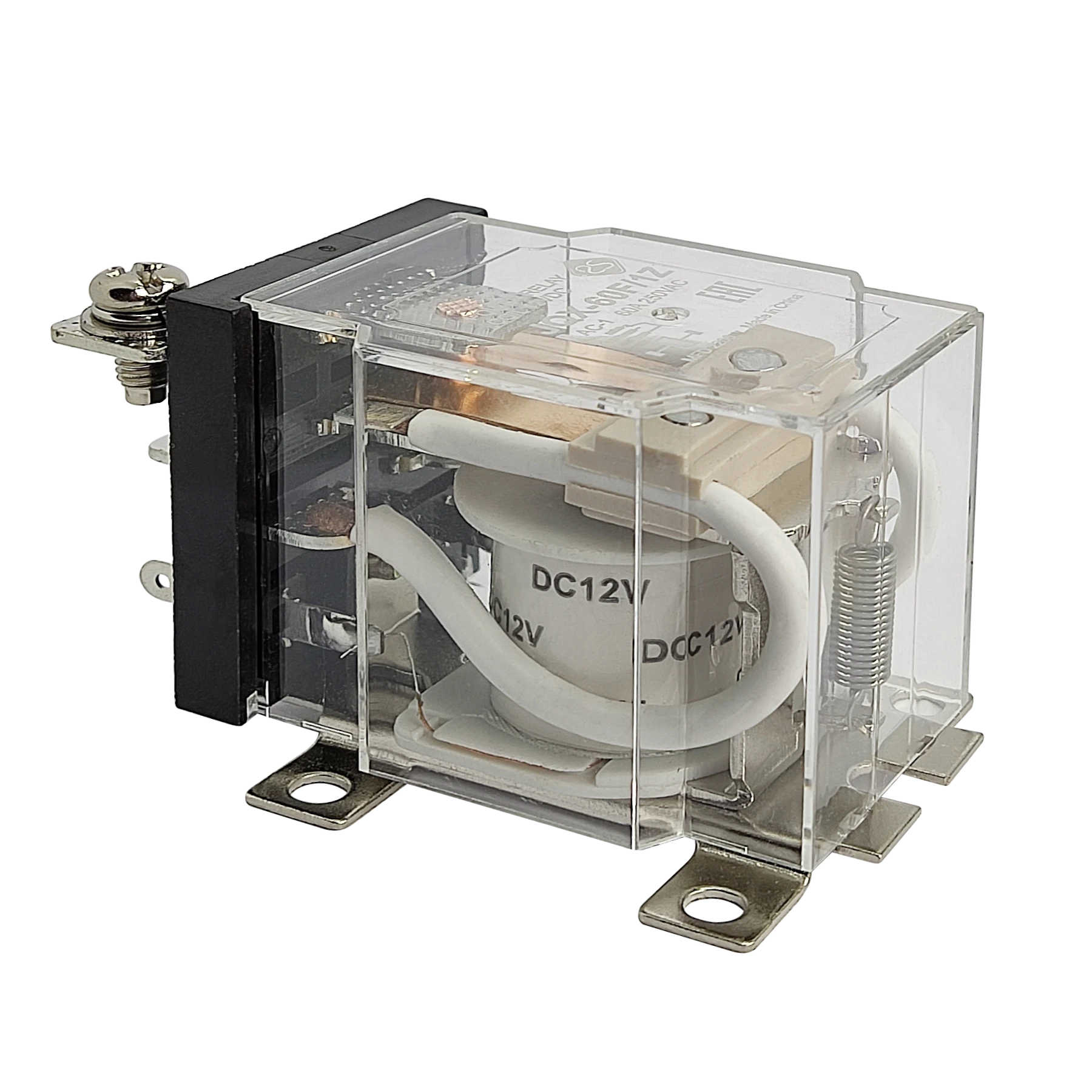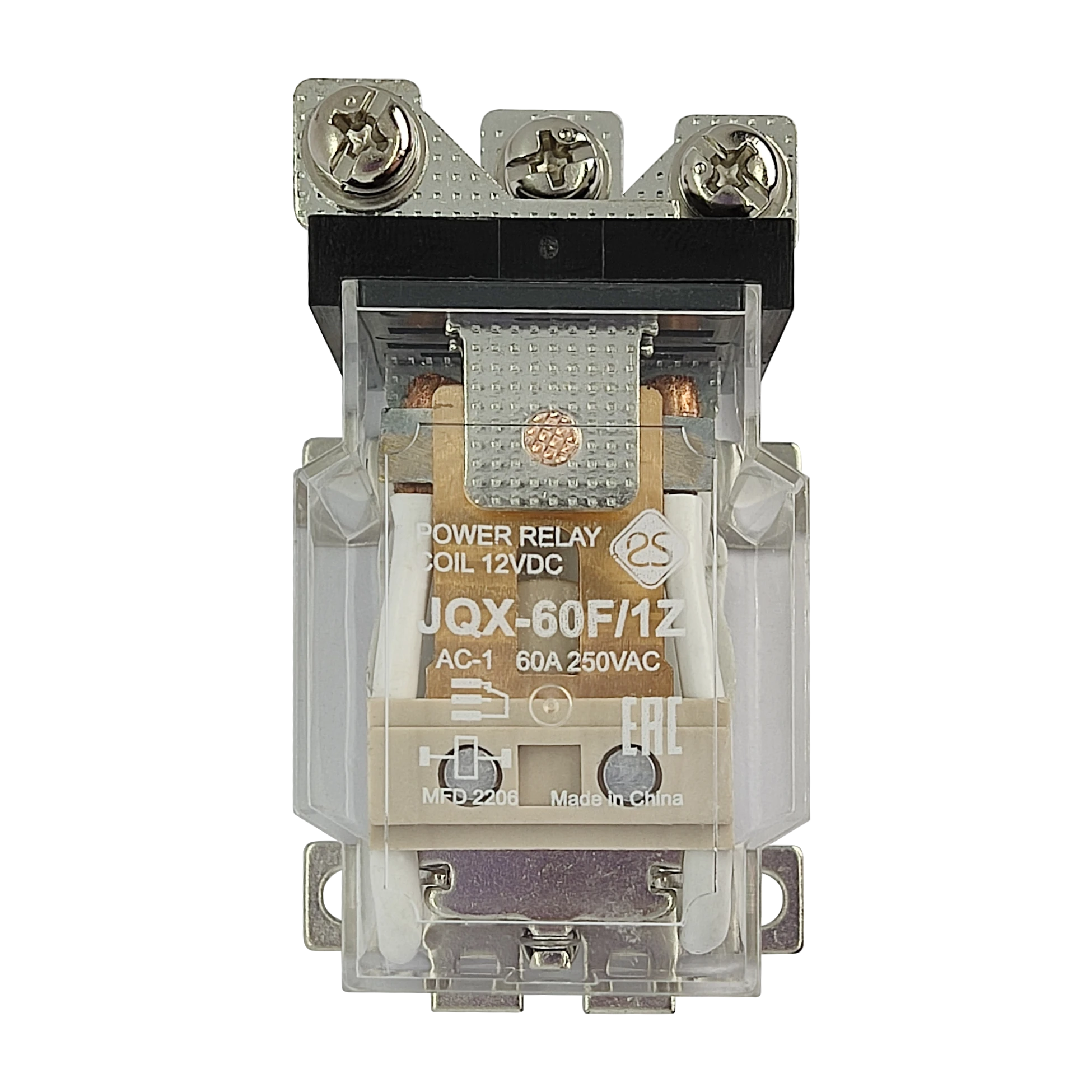 Силовое промежуточное реле JQX-60F с одним перекидным контактом. Допустимый ток через контакты до 60 ампер. Напряжение питания управляющей катушки - 12В постоянного тока.