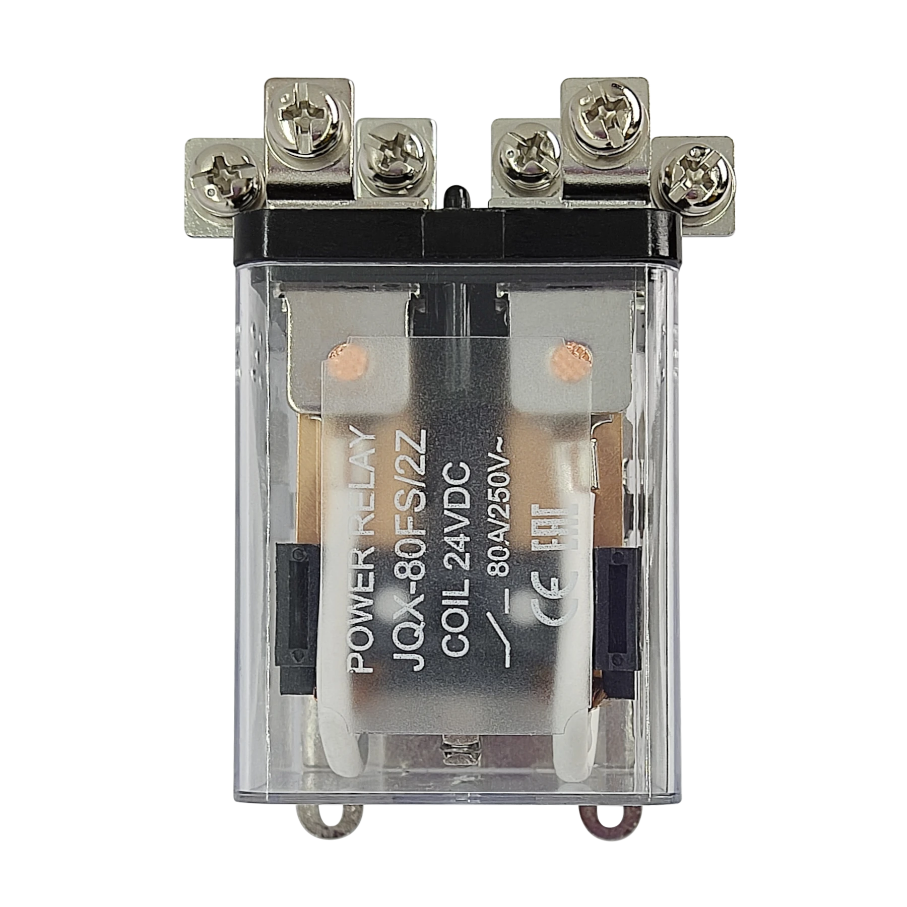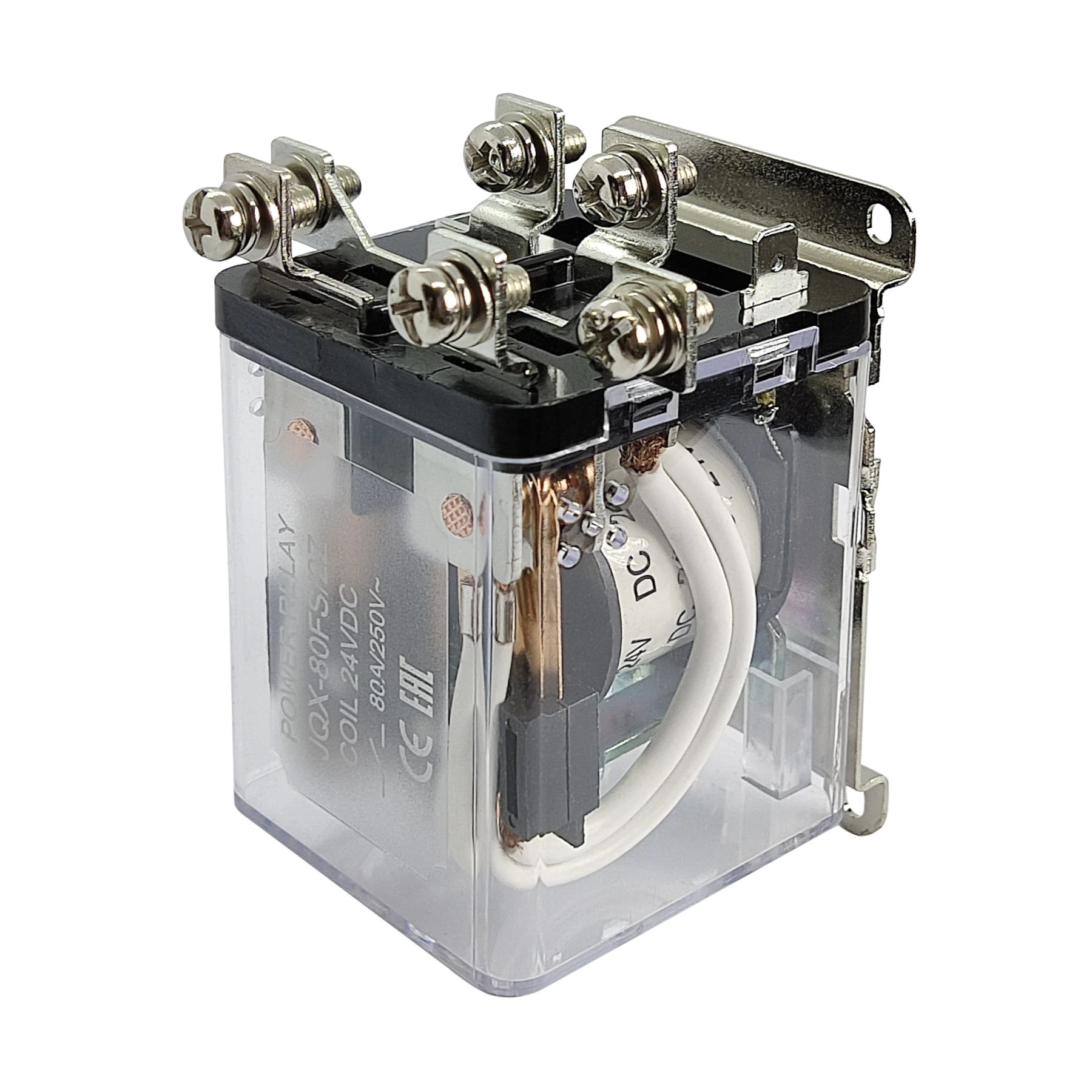 Силовое электромагнитное реле JQX-80FS 24VDC с двумя перекидными контактами (2PDT). Допустимый ток через контакты до 80 ампер. Управляющая катушка 24В постоянного тока.