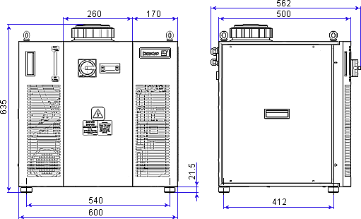 Выполнен в стальном корпусе с порошковым покрытием. Имеется возможность монтажа на крыше шкафа. Чиллер оборудован программируемым контроллером, что позволяет создать малый гистерезис температуры хладагента. Степень защиты корпуса IP54.