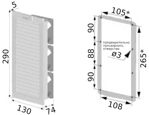 − Монтажный вырез 105х265 мм.