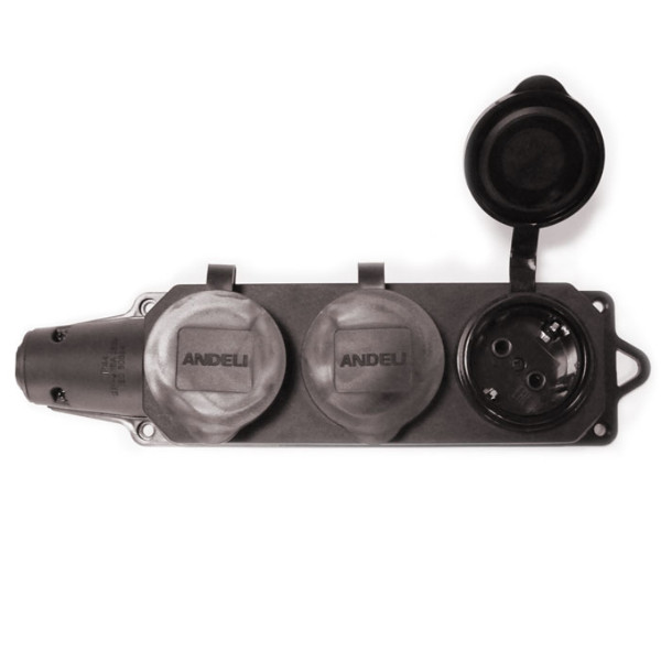 Каучуковая трехместная розетка AM-K03 с заглушками 2P+PE 16А 220В IP44 предназначена для эксплуатации как внутри помещений, так и на открытом воздухе. Она идеально подходит для электроинструмента и другого промышленного оборудования, для электроснабжения бытовок и киосков и т.д.