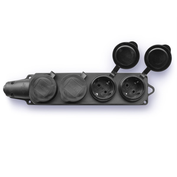 Каучуковая четырехместная розетка AM-K06 с заглушками 2P+PE 16А 220В IP44 предназначена для эксплуатации как внутри помещений, так и на открытом воздухе. Она идеально подходит для электроинструмента и другого промышленного оборудования, для электроснабжения бытовок и киосков и т.д.