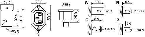 Электрический сетевой разъем 0708-1-СW. Предназначен для установки в различное электрооборудование и подключение его к однофазной электрической сети. Крепление разъема осуществляется двумя винтами или саморезами на корпусе оборудования. Материал корпуса Nylon6.6, контакты выполнены из никелированной латуни. Рабочий ток до 15А 250Vac. Температурное исполнение T65.