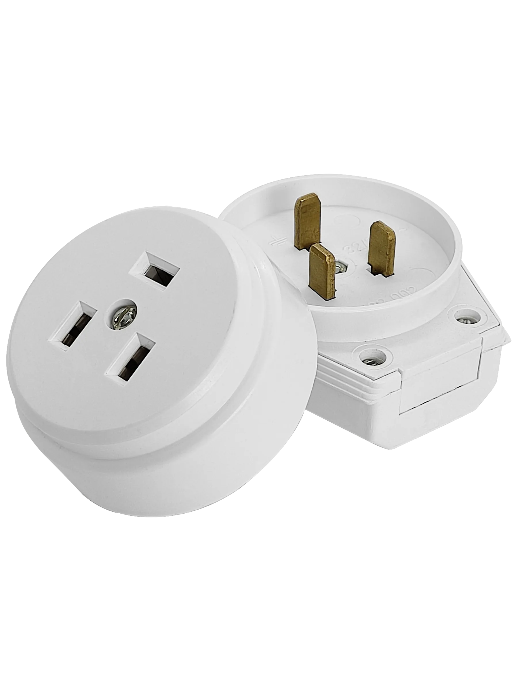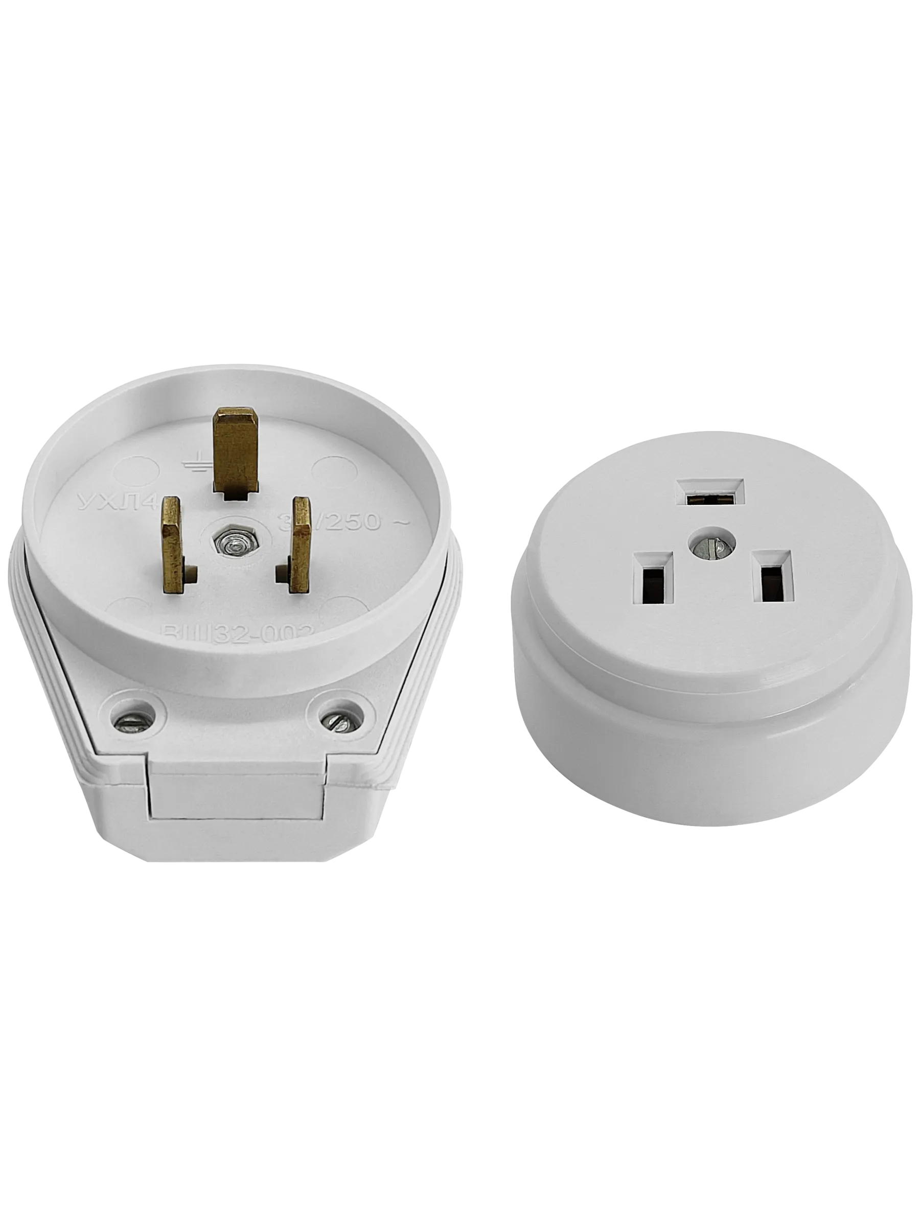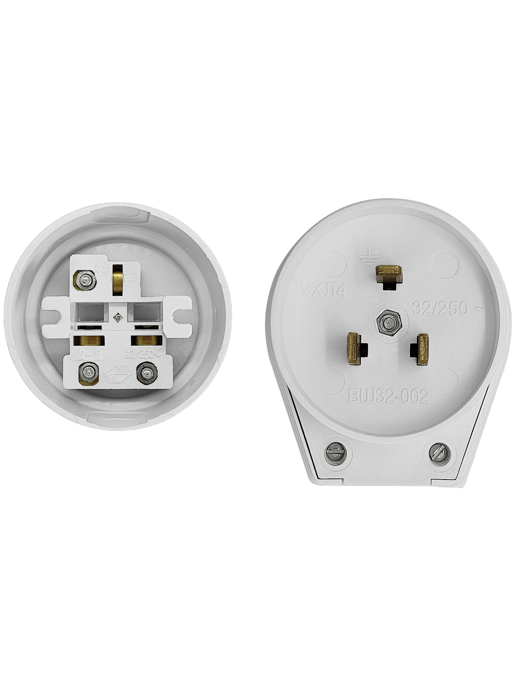 Соединитель электрический РВШ 32-002 предназначен для подключения электрооборудования (в частности, электроплит) к однофазной электросети с заземлением. Мощность электрооборудования не должна превышать 8кВт (оптимально – 7кВт). Реализуется комплектом из вилки и розетки.
