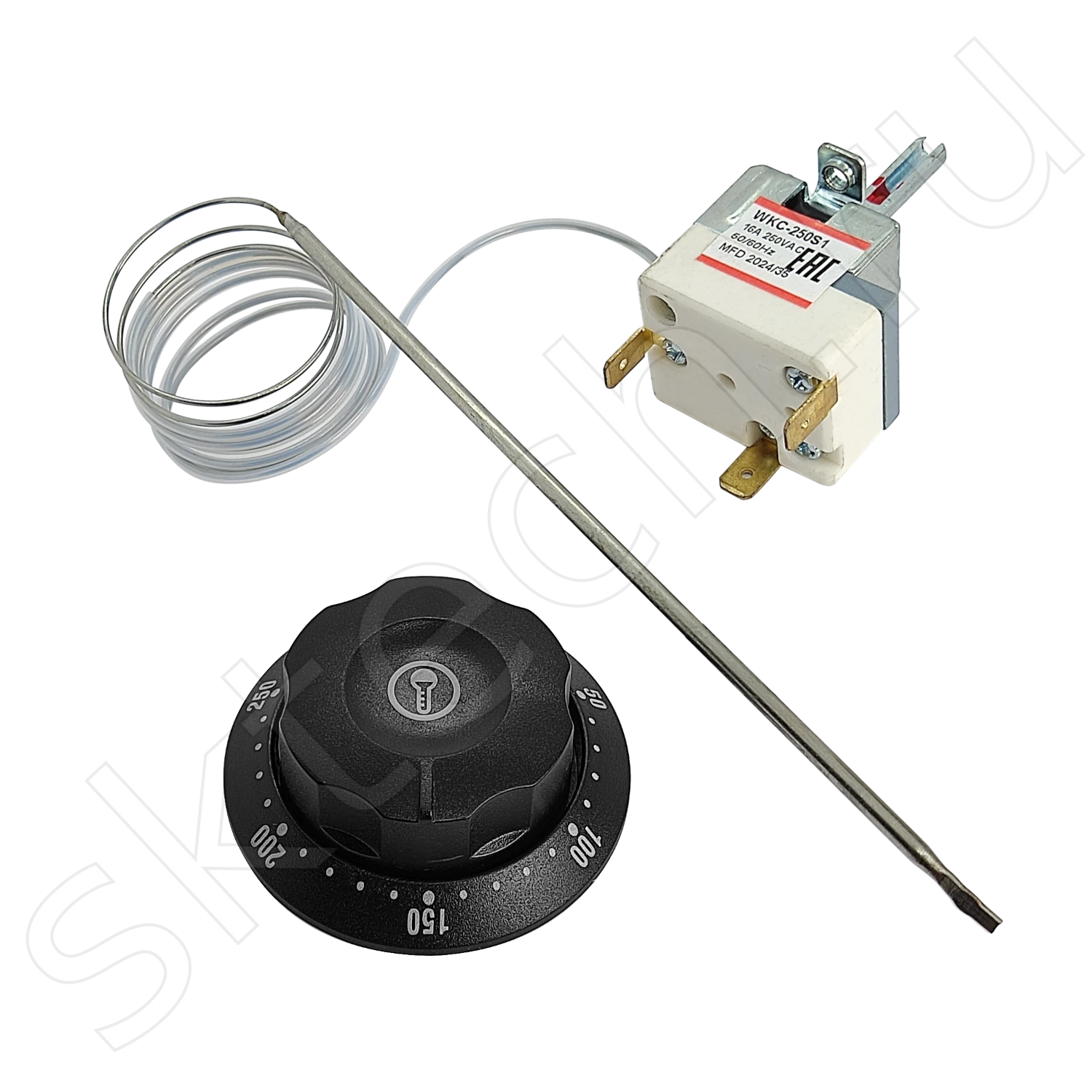Капиллярный термостат WKC-250S1 с нормально закрытым контактом имеет диапазон регулирования от 50°C до 250°C.