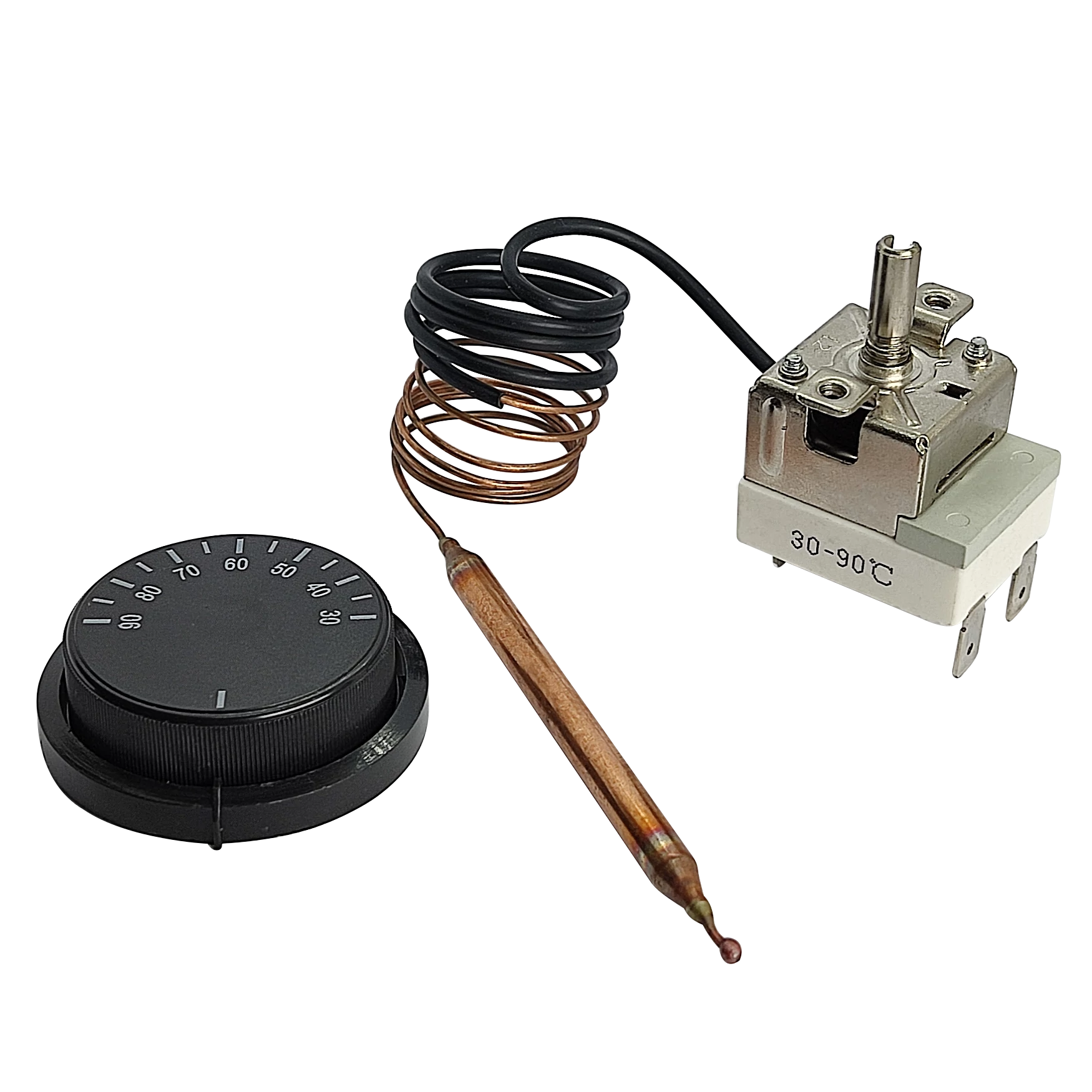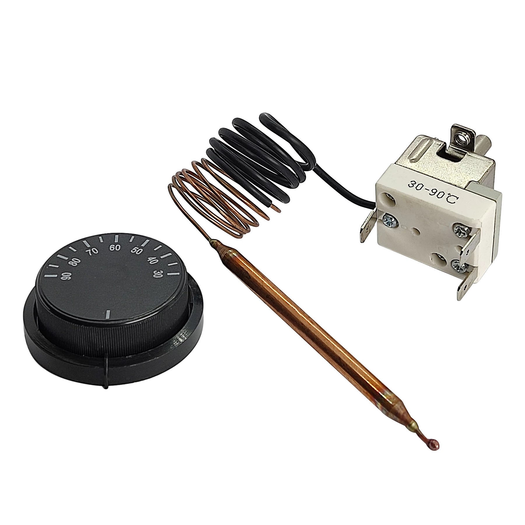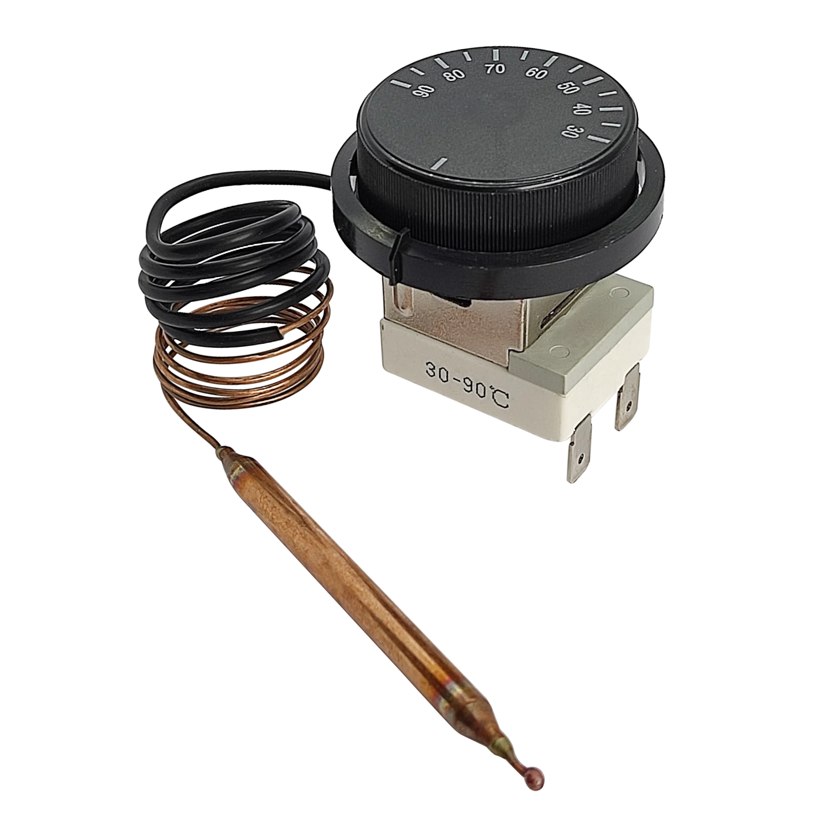 Капиллярный термостат WKC-90C2 имеет переключающий контакт и диапазон регулирования от 30°C до 90°C. Датчик температуры изготовлен из меди и представляет собой капиллярную трубку длиной 1000 мм, припаянную к трубчатому датчику диаметром 6 мм.