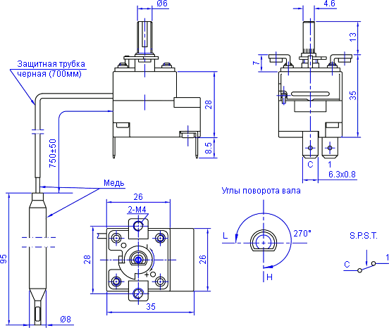 Размеры и схема срабатывания капиллярного термостата WYF40J