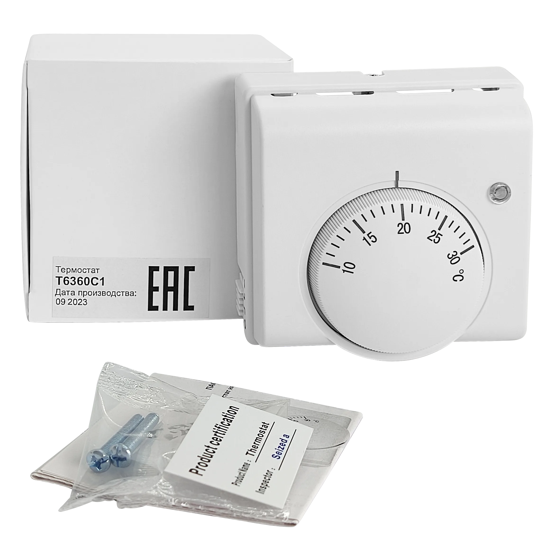 Регулируемый настенный термостат T6360C1 с выключателем предназначен для поддержания заданной температуры в помещении путем автоматического размыкания или замыкания электрической цепи. Термостат не имеет собственного электропотребления.
