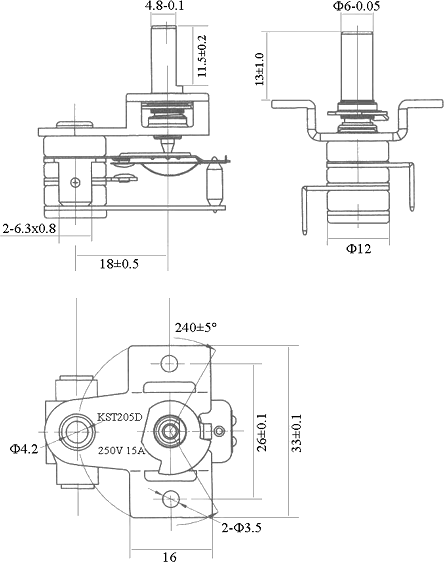 Температура размыкания контакта при максимальном угле поворота вала 240°125±7°С