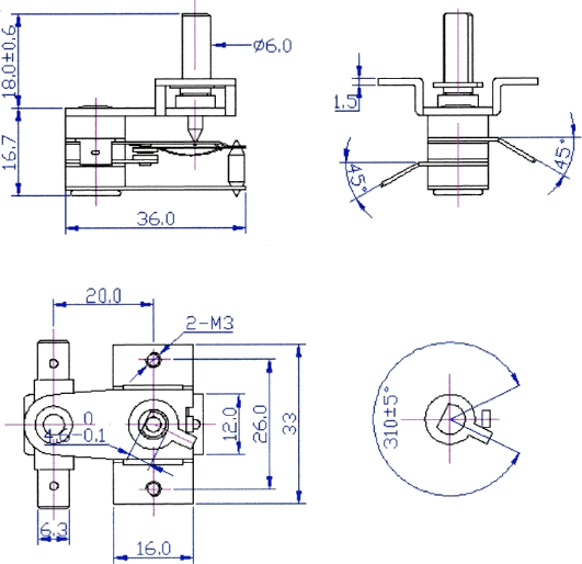 Температура размыкания контакта при максимальном угле поворота вала 310°70±5°С