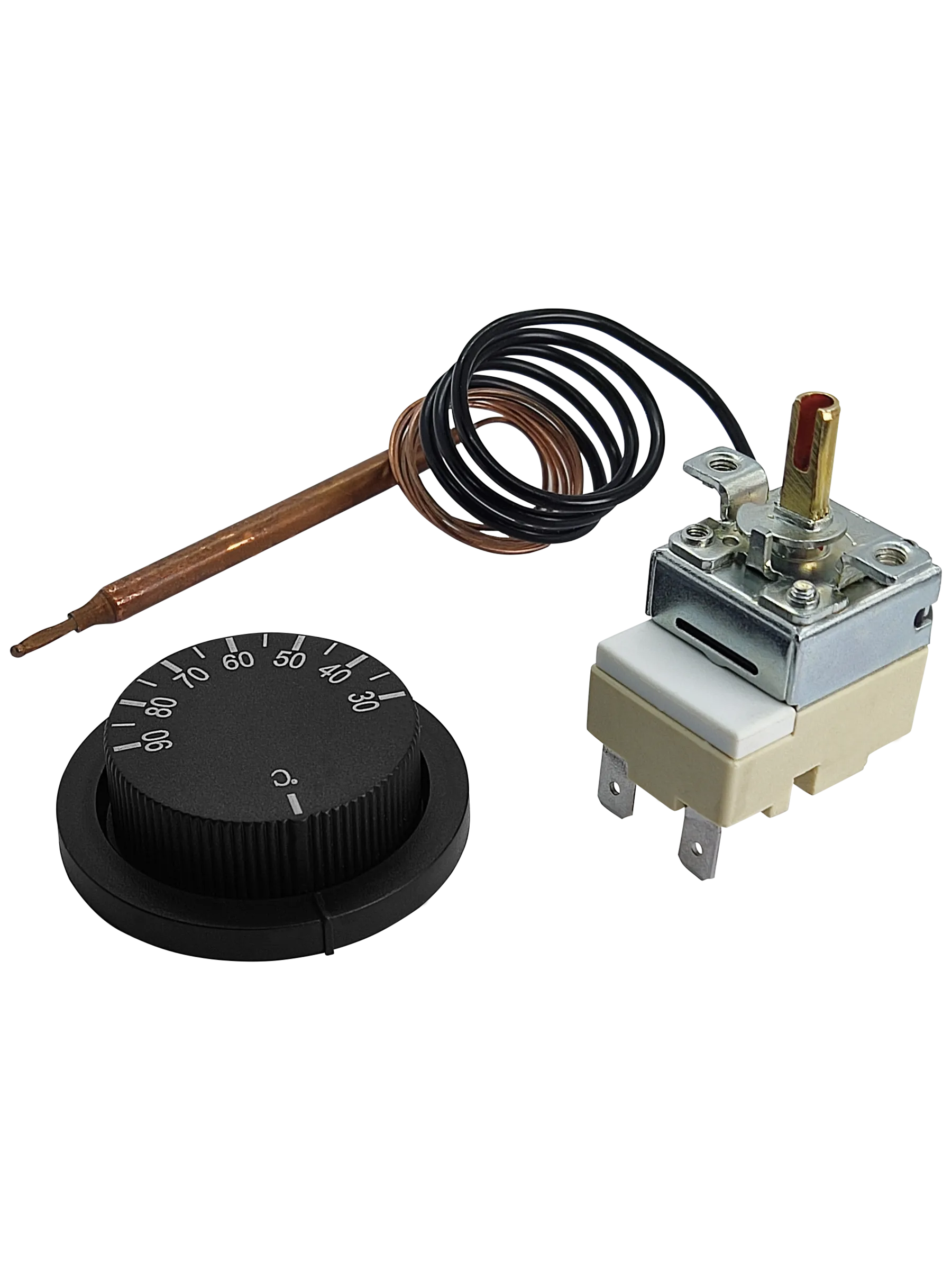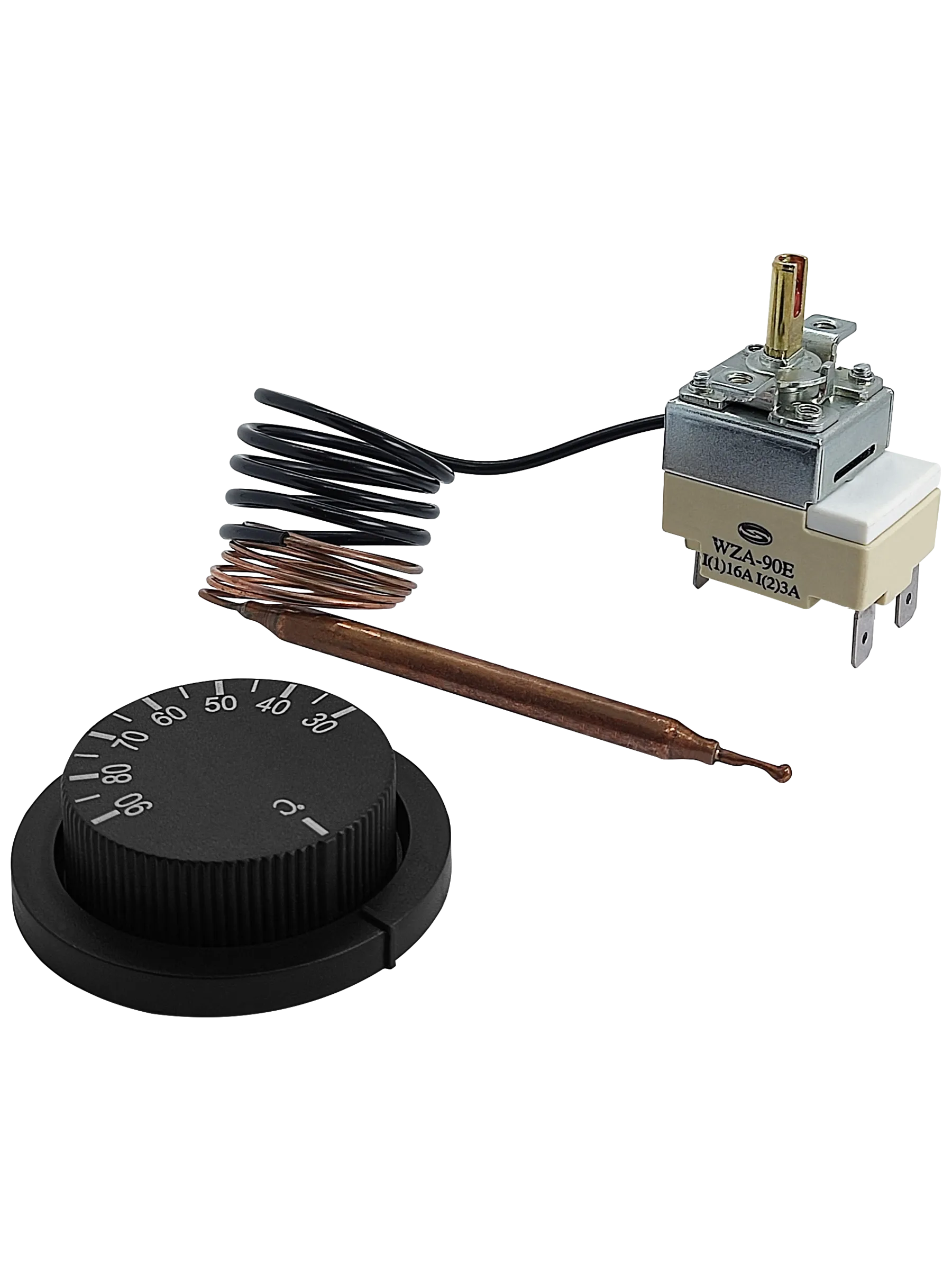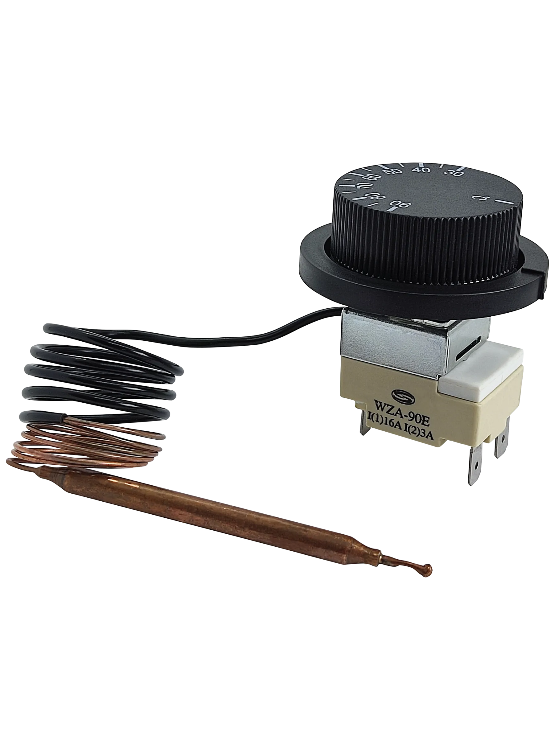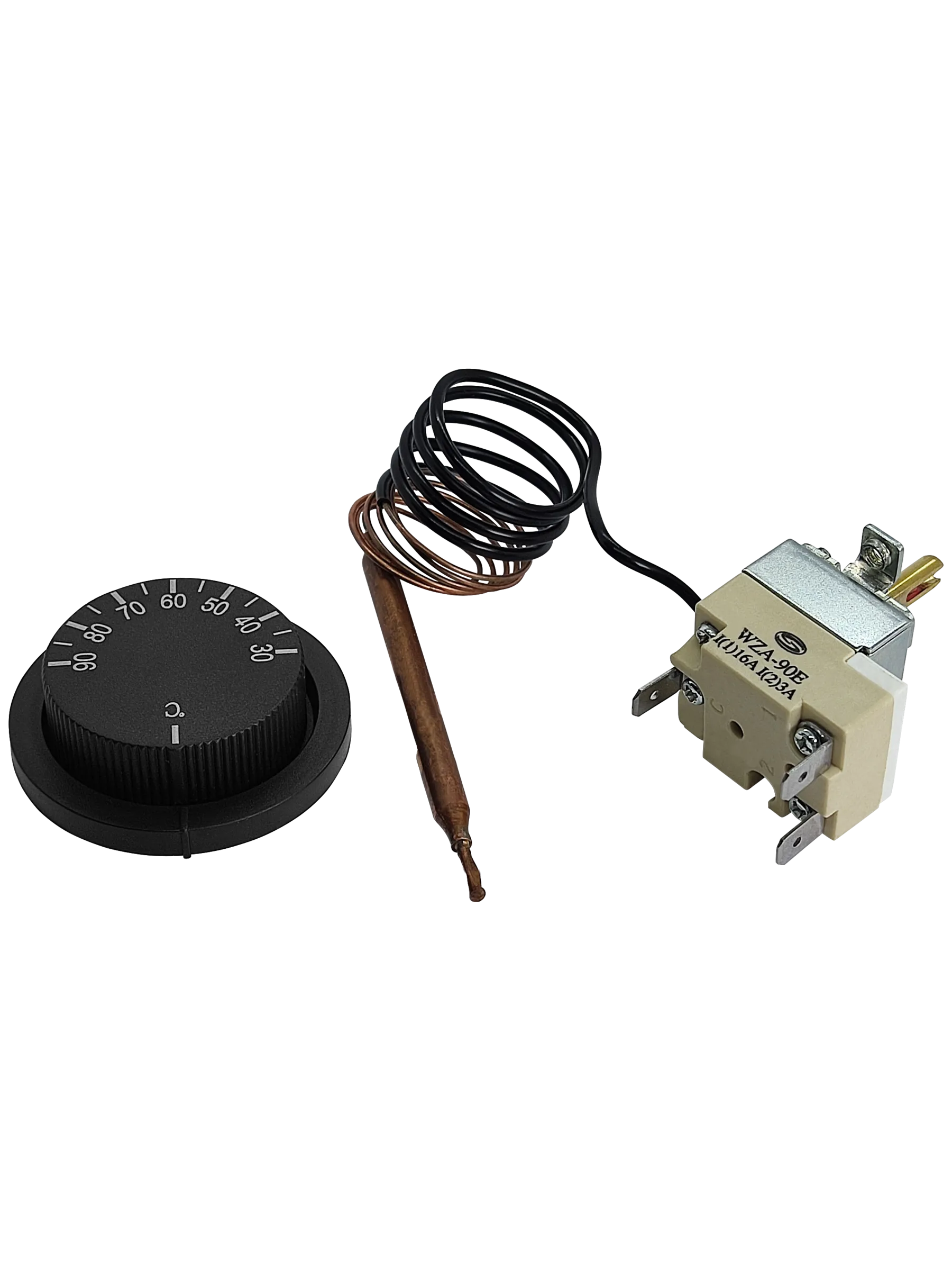 Капиллярный термостат WZA-90E имеет переключающий контакт и диапазон регулирования от 30°C до 90°C. Датчик температуры изготовлен из меди и представляет собой капиллярную трубку длиной 1000 мм, припаянную к трубчатому датчику диаметром 6 мм.