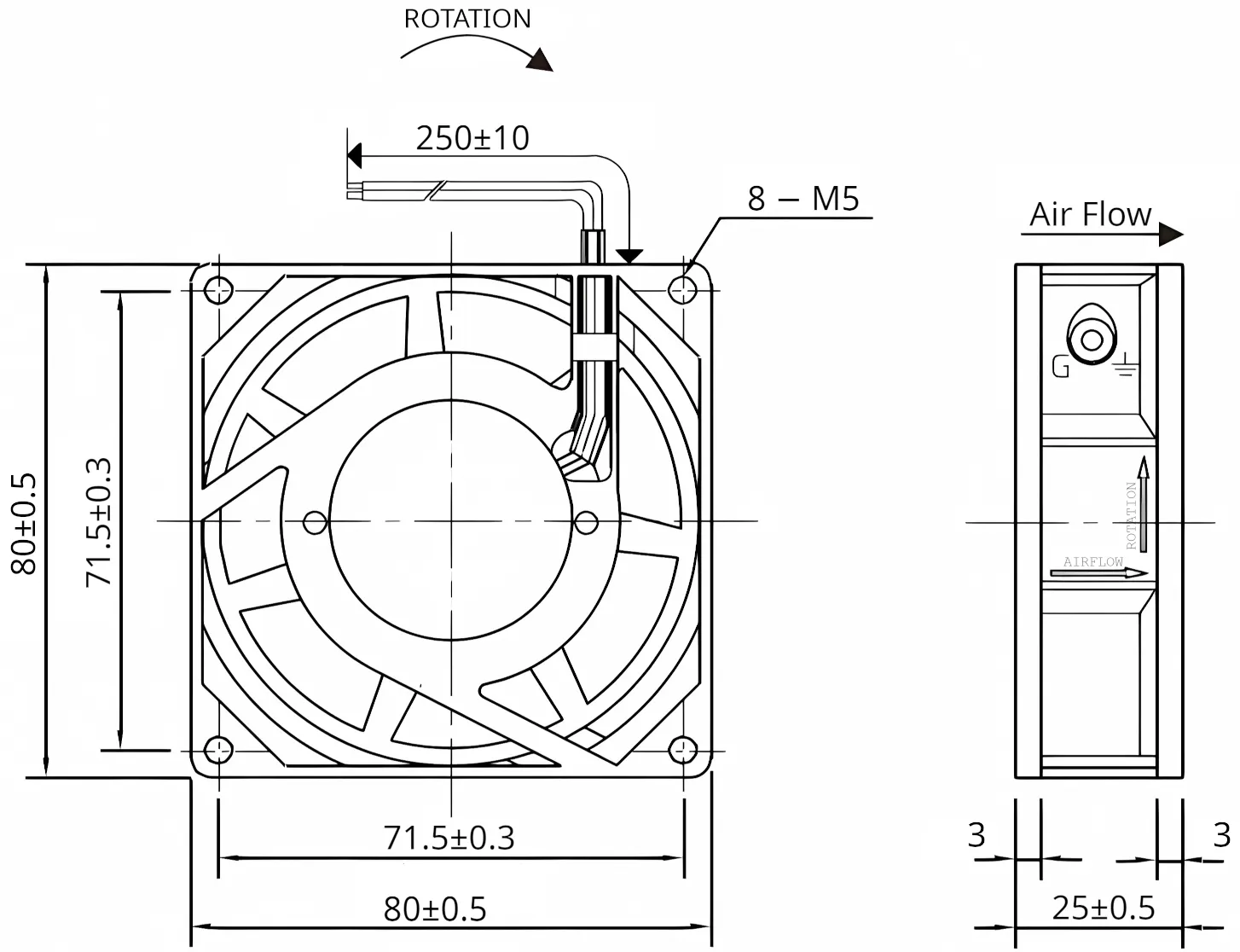 Размеры компактного осевого вентилятора AC-08025MBW-220