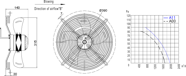 Кривая производительности и размеры вентилятора YWF.A4S-315B5DII-A11