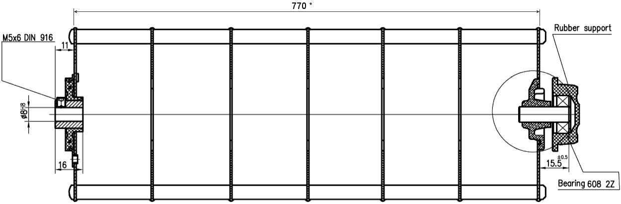 Диаметр колеса - 100мм, длина рабочей части колеса - 770мм.