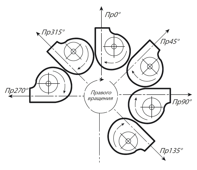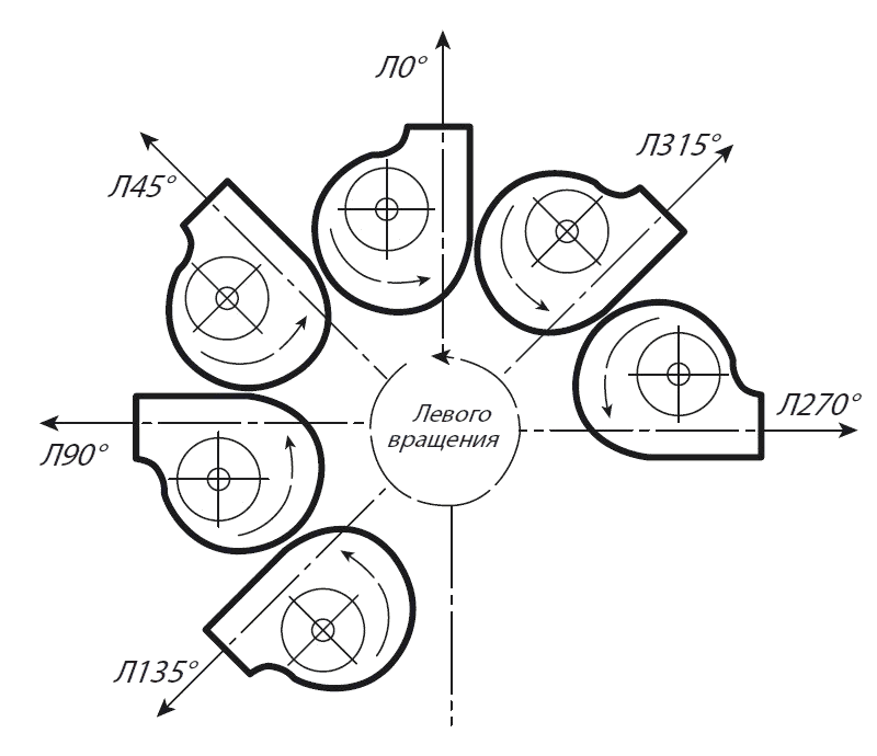 Вентиляторы изготавливаются как правого, так и левого вращения (правое почасовой стрелке, левое против часовой стрелки - вид со стороны всасывания). Корпус(улитка) изготавливается с углом разворота как показано ниже.