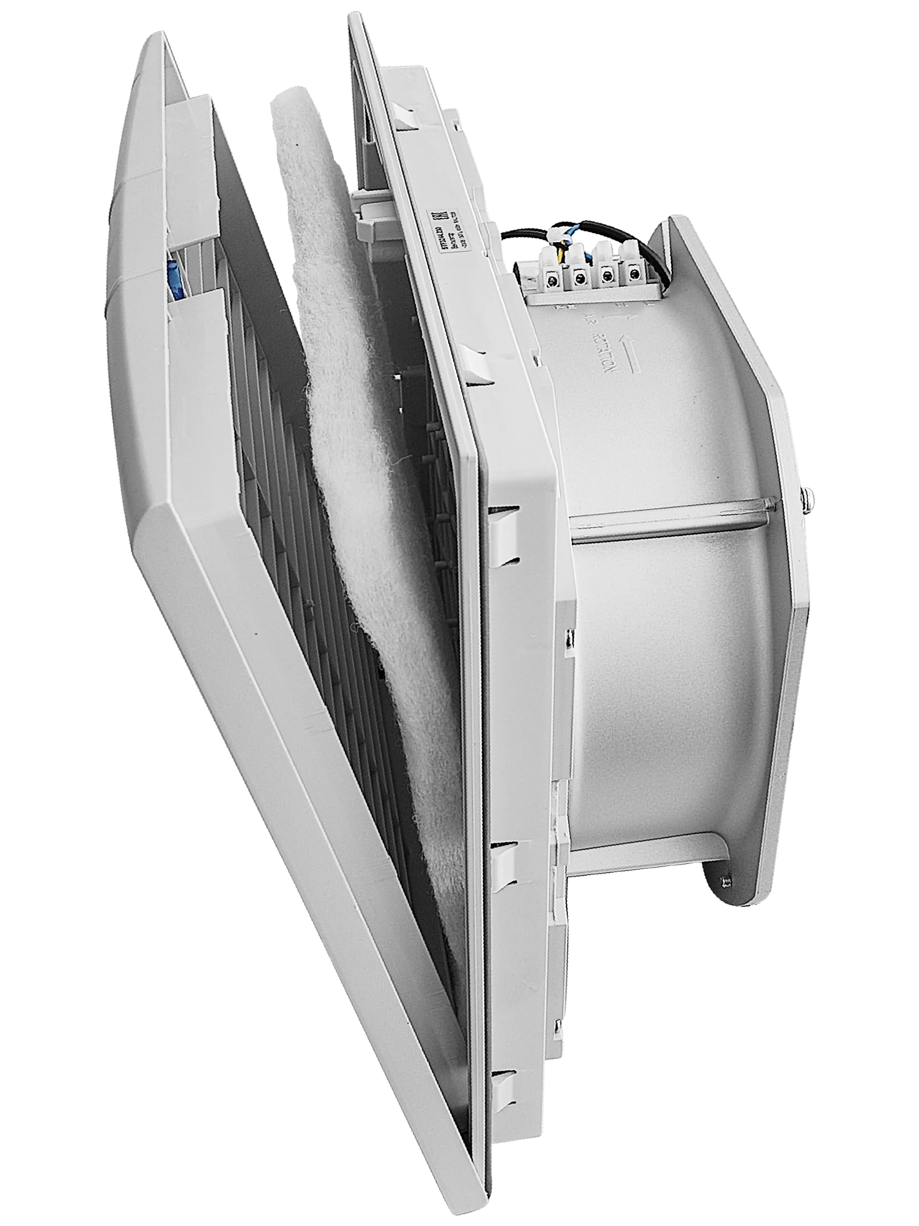 Вытяжной вентилятор с фильтром STF3244.230 RAL7035 с удобным механизмом для быстрой замены фильтрующего материала. Имеет встроенное уплотнение из резины. Подключение с помощью клеммной колодки.