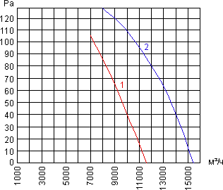 Максимальный воздухопоток15500 м³/ч (подключение треугольником, кривая 2)
