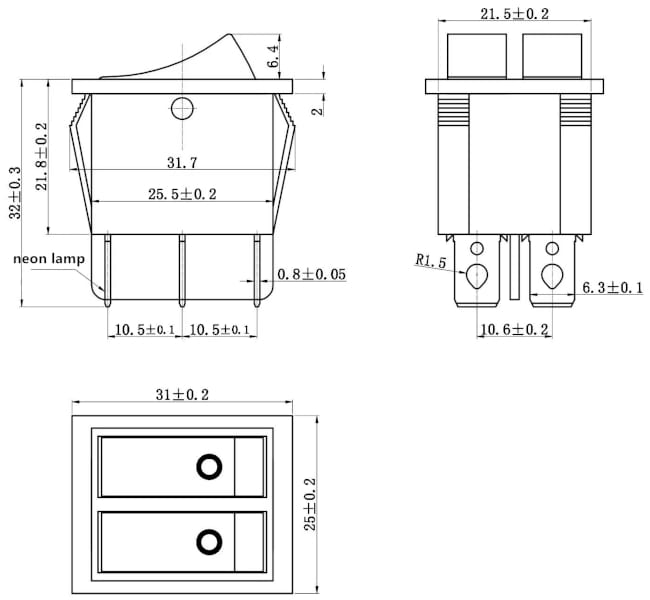 Двухполюсный клавишный выключатель KCD6 выполнен в белом пластиковом корпусе и имеет 2 красных глазка.